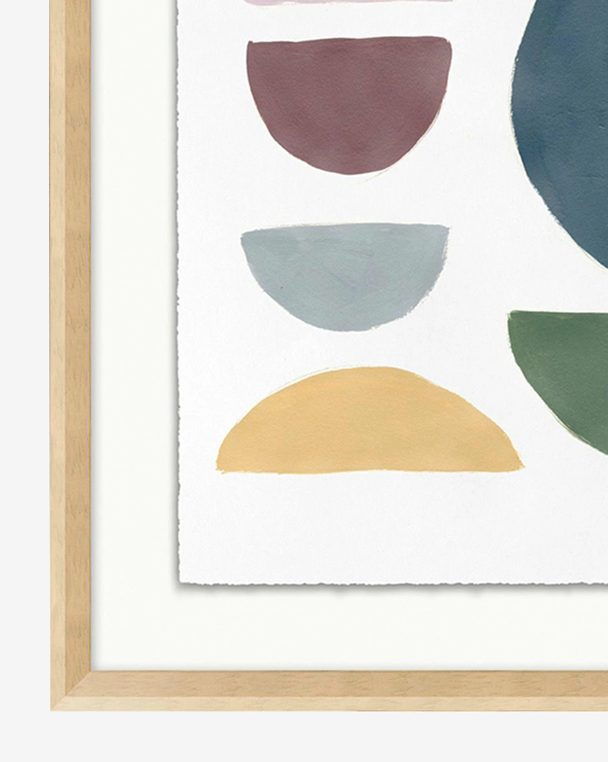 In a composition that embraces shape and tone, Abstract Shapes II brings intriguing brightness to artwork in the home. Colorful objects are playfully arranged throughout the piece, lending a whimsical yet sophisticated element to your decor. A giclee print on watercolor paper within a blond maple frame, this abstract piece is presented with gallery-quality materials.