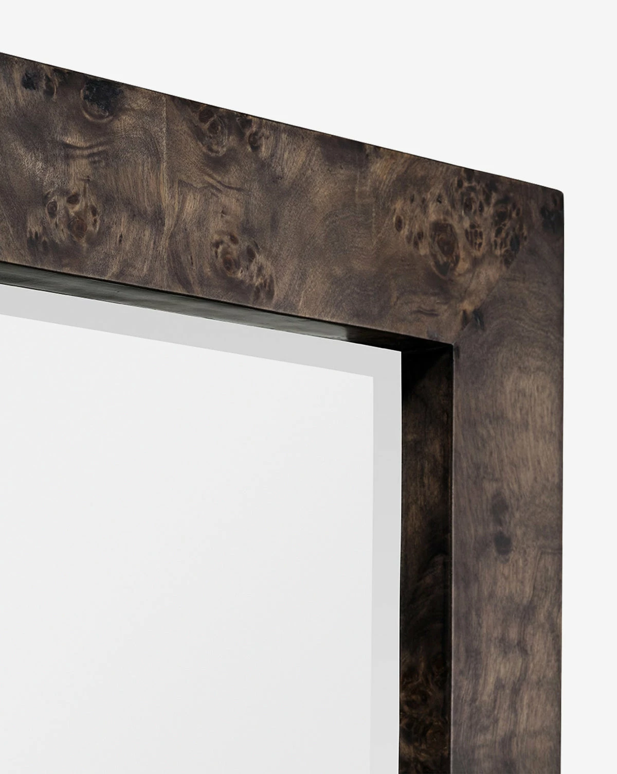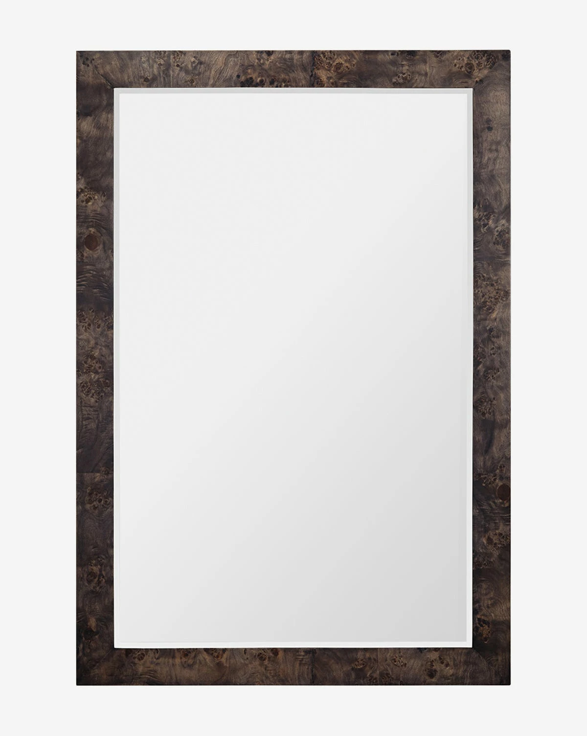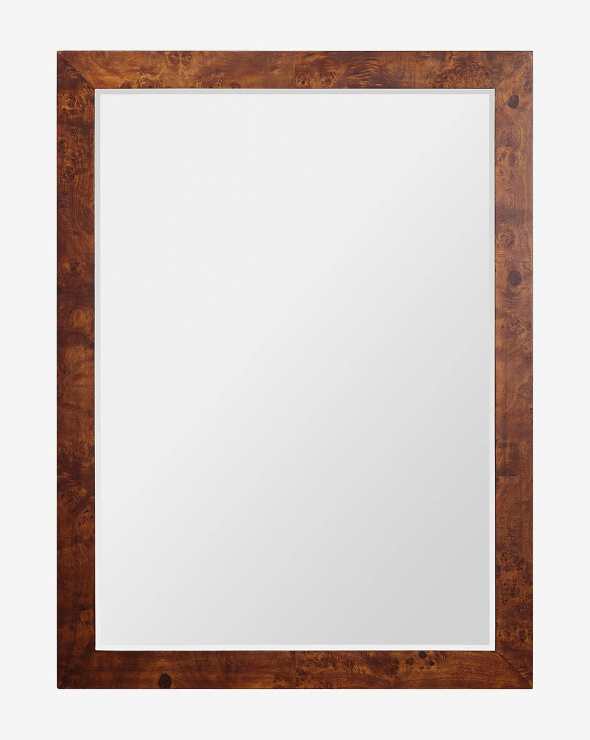 In a rich color, the Alexia Rectangular Mirror is a statement piece. Its frame that shows off the unique pattern of burl wood elevates your decor in any room, reflecting nature and amplifying light throughout the space.