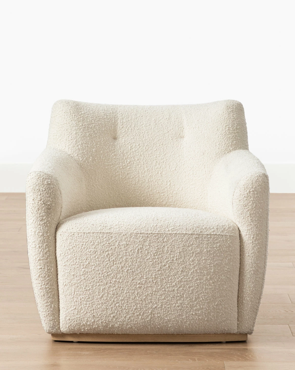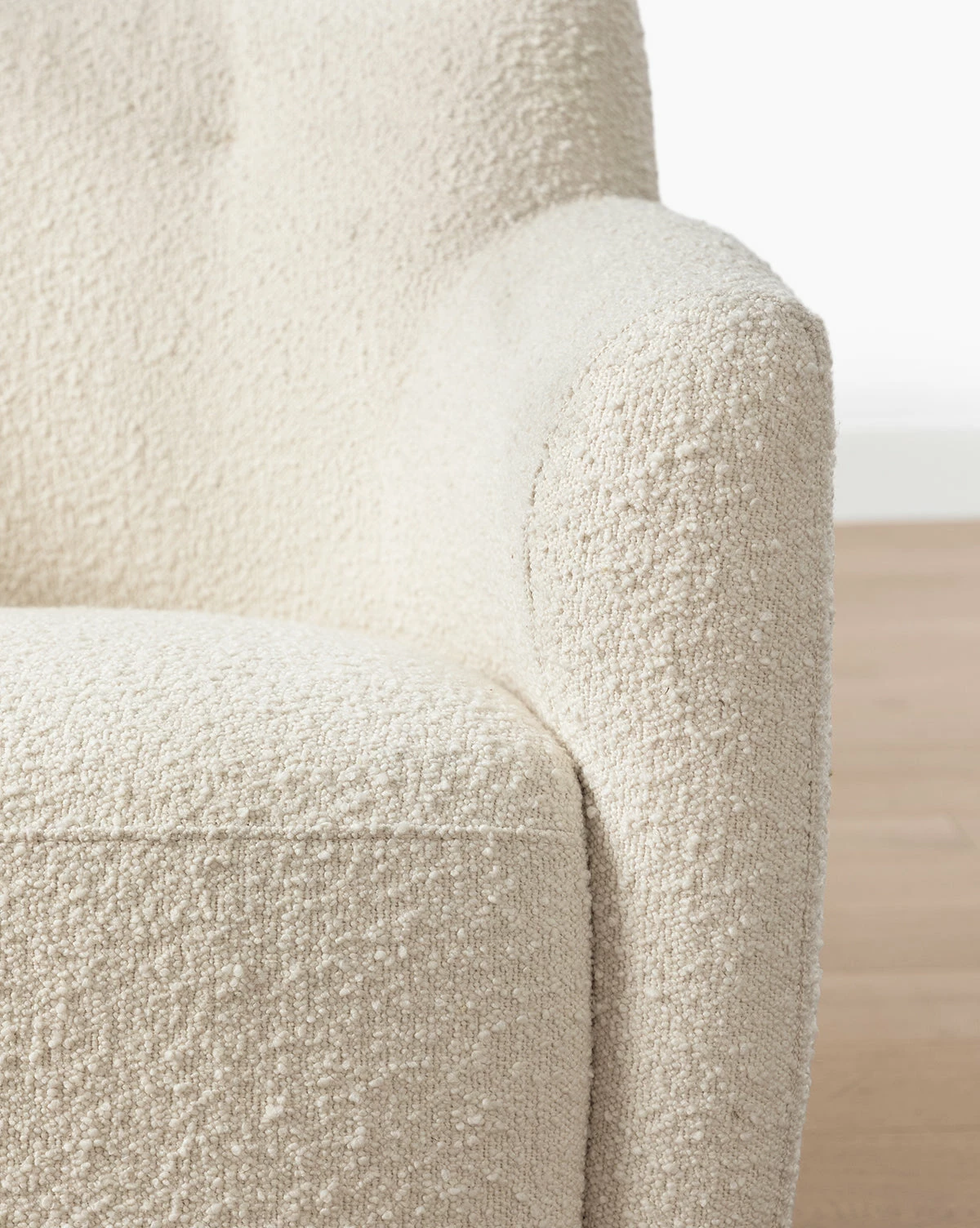 A textural take on a classic accent chair, the Alford Accent Chair is crafted from cream boucle in a softly curved design. Its dramatic, poised form is subtle yet pronounced, and its comfortable cushions give practical and aesthetic beauty in any space, from living rooms to bedrooms.