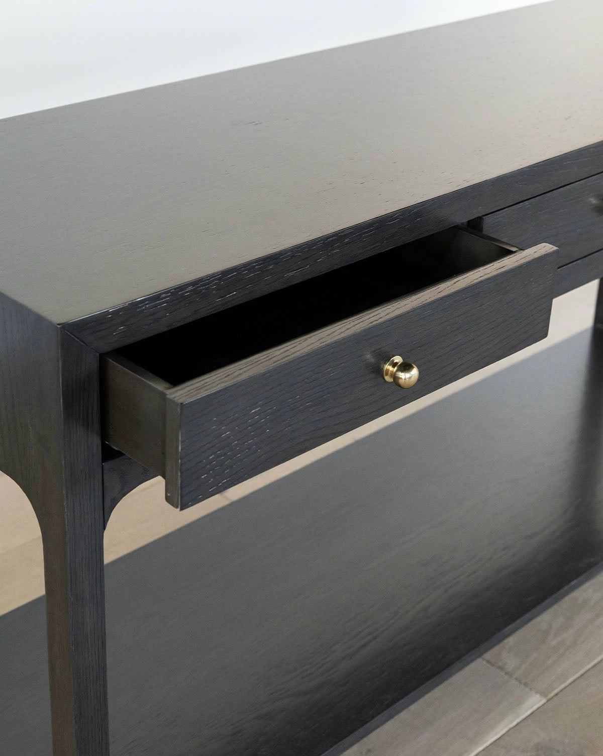 Crafted from traditional roots, the Allen Console is finished in either an inky black hue or rustic oak, bringing a modern update to your space. Rounded details and brass pulls add interest to the sophisticated design, as its simple form makes the perfect base for an entryway vignette, complementing anything from vases to art placed on top.