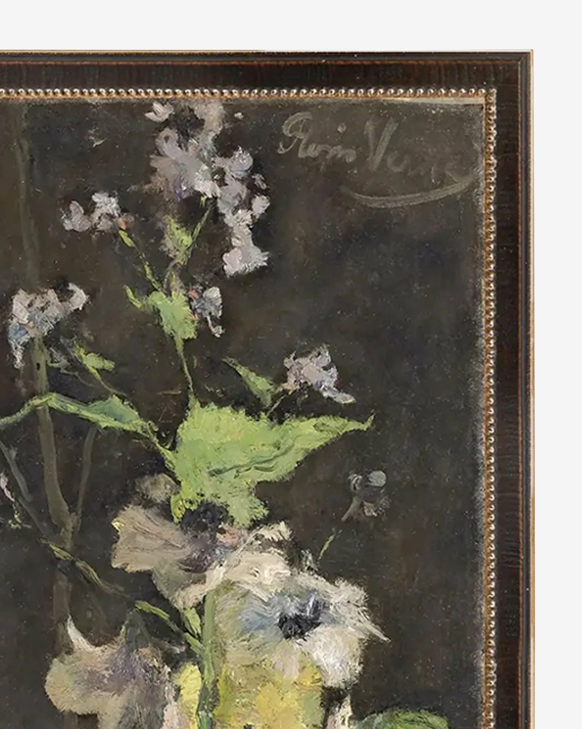 Anemones Still Life is a romantic piece painted with soft, expressive brush strokes. Its brighter tones of green and blush contrast a shimmering gold vase and a smoky background. This giclee print of an 1888 original is presented within a dark wood frame featuring beaded details.
