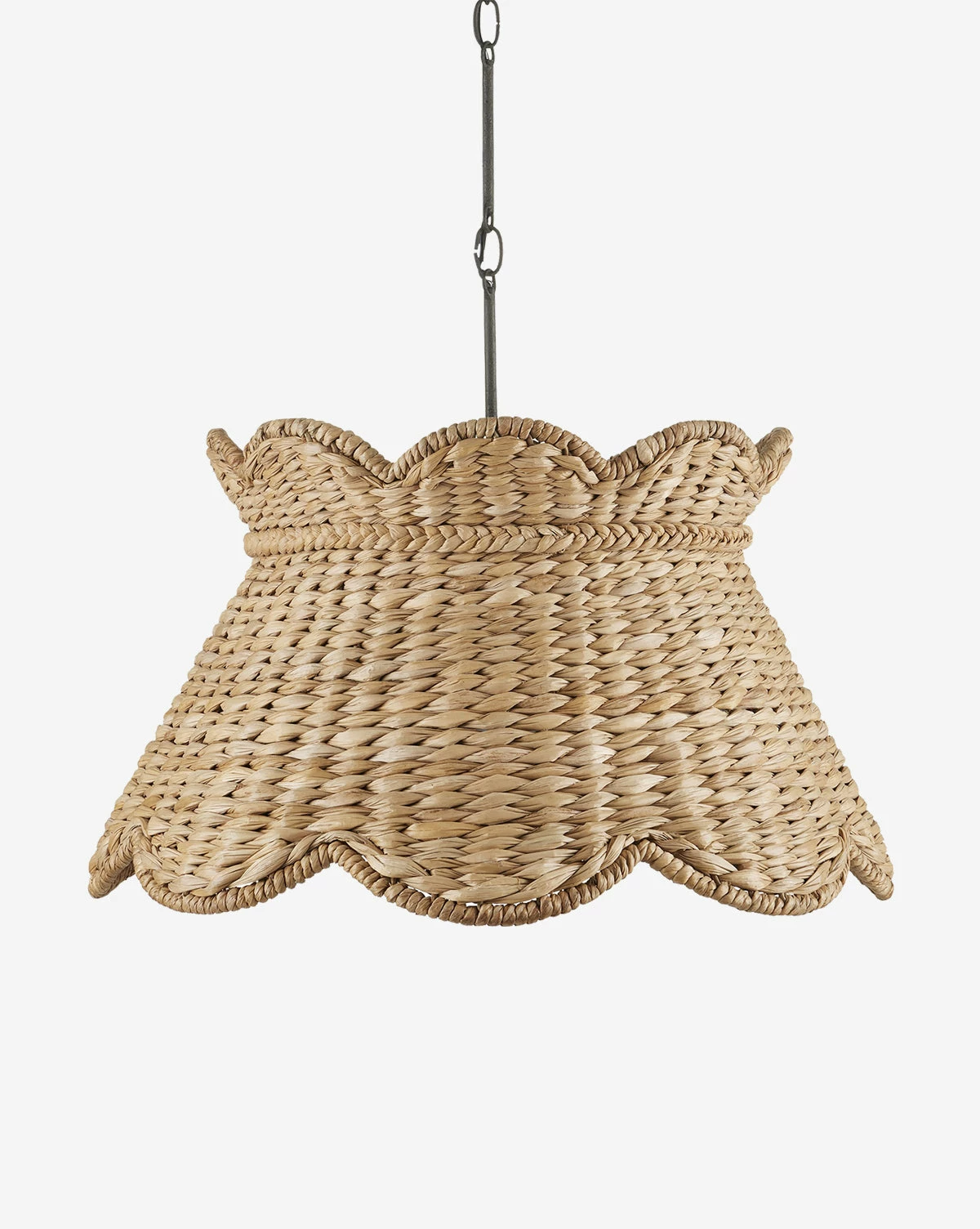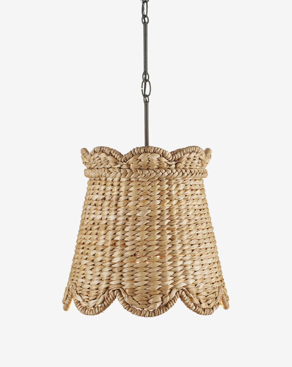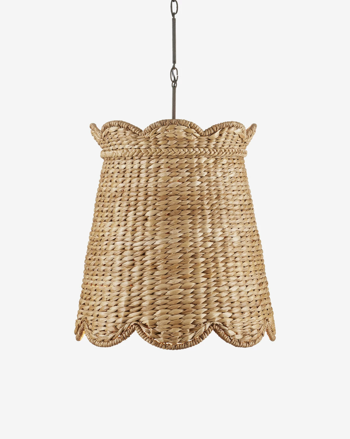 In a classic and organic design, the Annabelle Pendant features a tapered shade made from handwoven water hyacinth. With a wrought iron chain, the pendant makes a statement with its artisan feel and mixed materials.