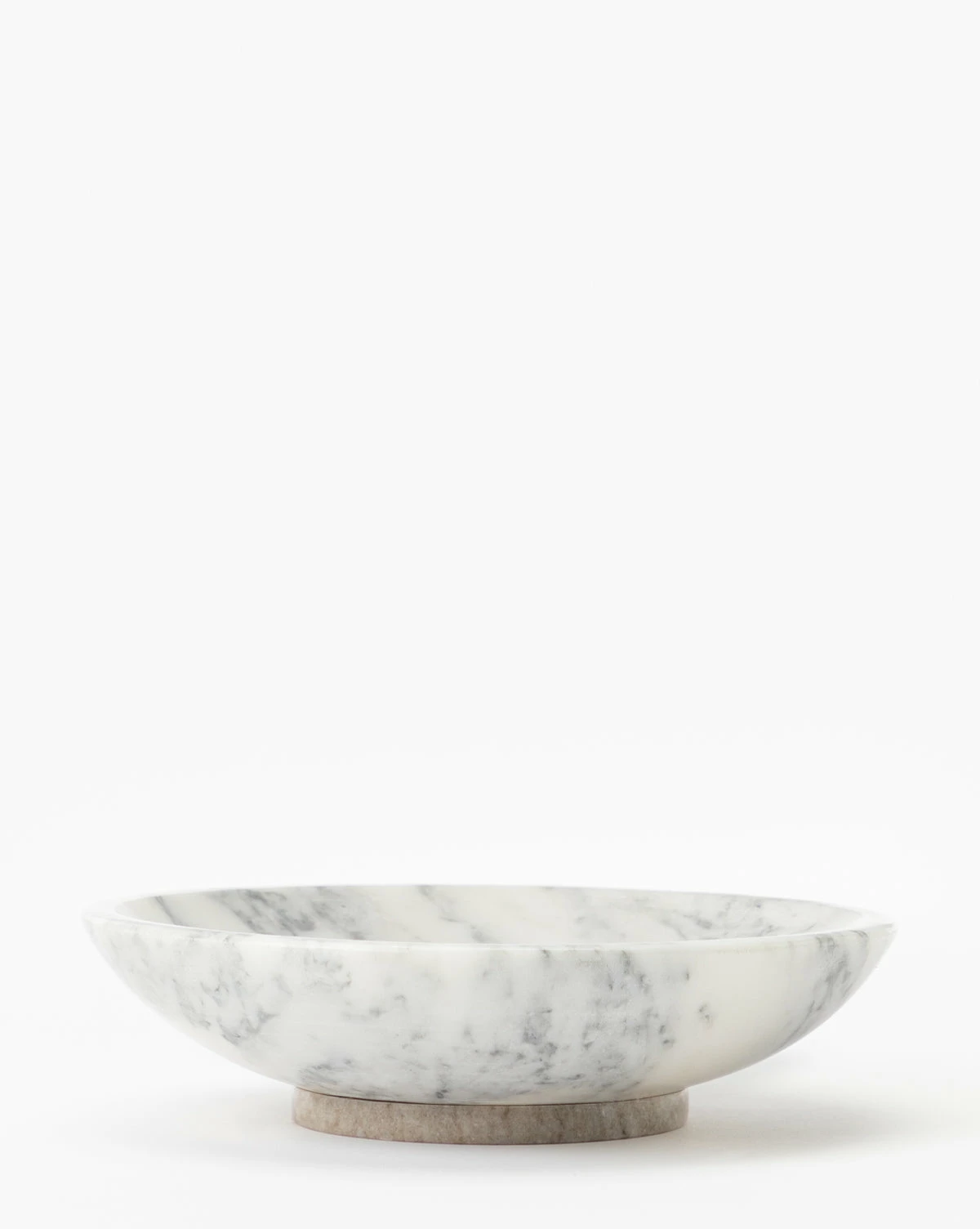 Luxuriously detailed, the Arabesco Marble Bowl is brimming with natural marbling and designed in a sculpturally delicate silhouette. Its broad, shallow bowl is propped atop a slim pedestal, creating a subtle lift that accentuates the elegant curvature of the piece.