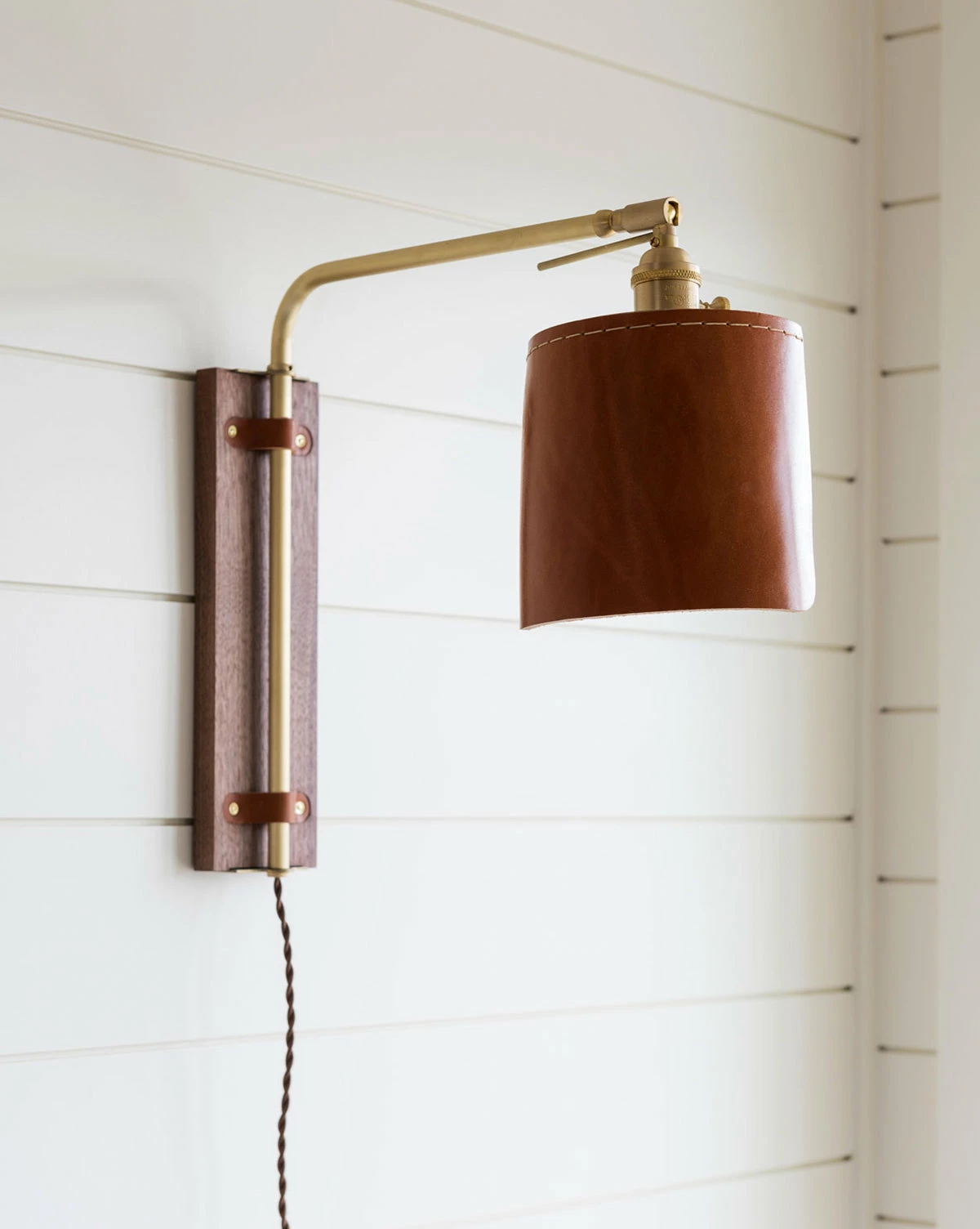 Bring custom made lighting to your home with the Ava Wall Sconce.  From the sketchbook to the final product every detail about this light was carefully considered.  Hung from a black walnut backplate, it’s brass metal arm articulates to fulfill any angle of lighting needed.  Possibly its most noticeable feature is its hand-sewn leather shade, that pairs beautifully with its other warm metal and wood parts. Â