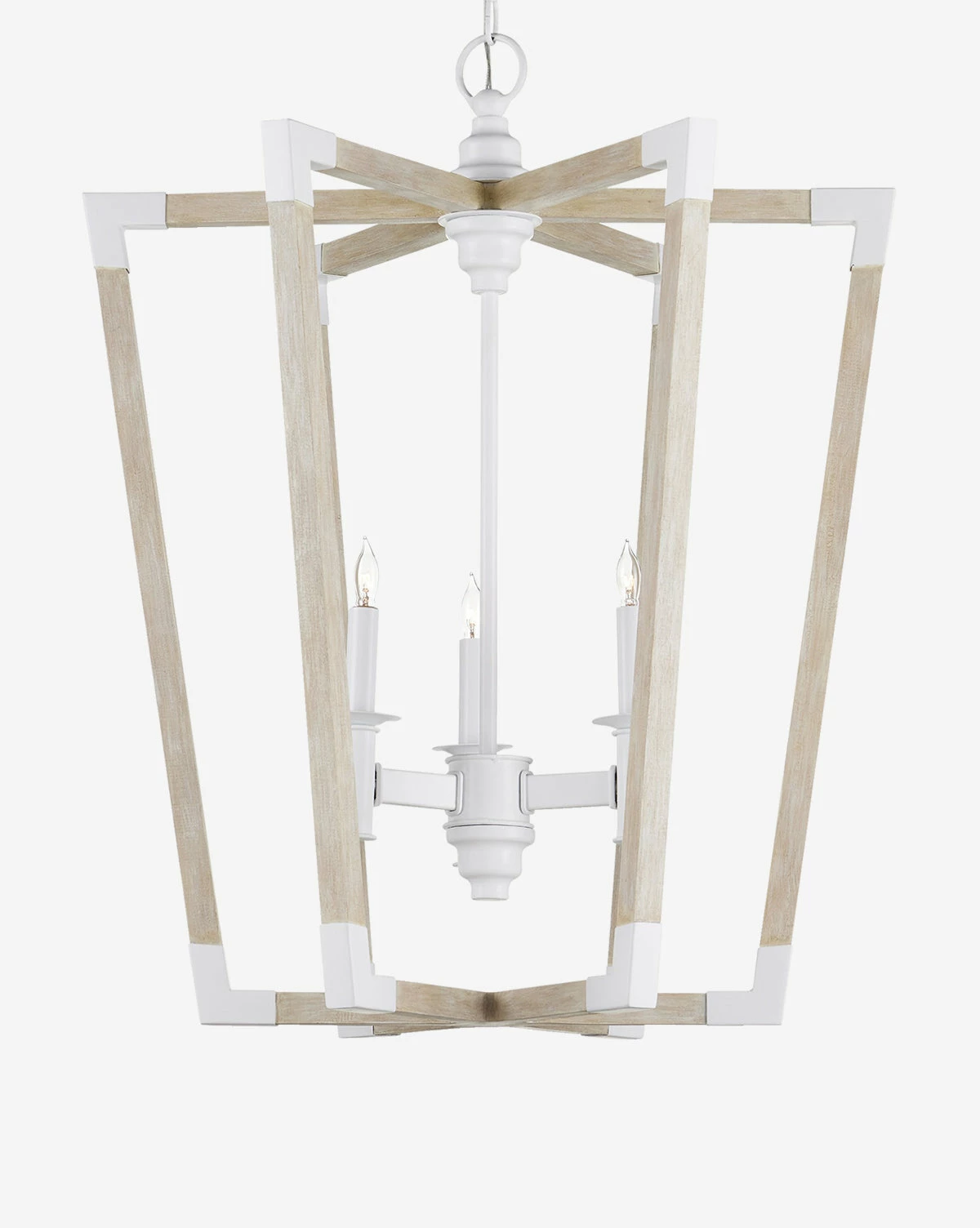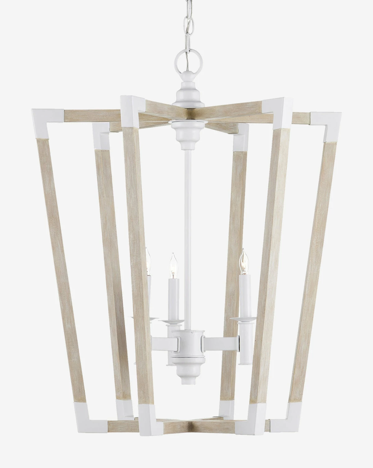 The Bastian Sandstone Chandelier brings modern form to traditional cage lighting. Its geometric form is made with wood and iron corners, set to highlight the candelabra fixture it houses.