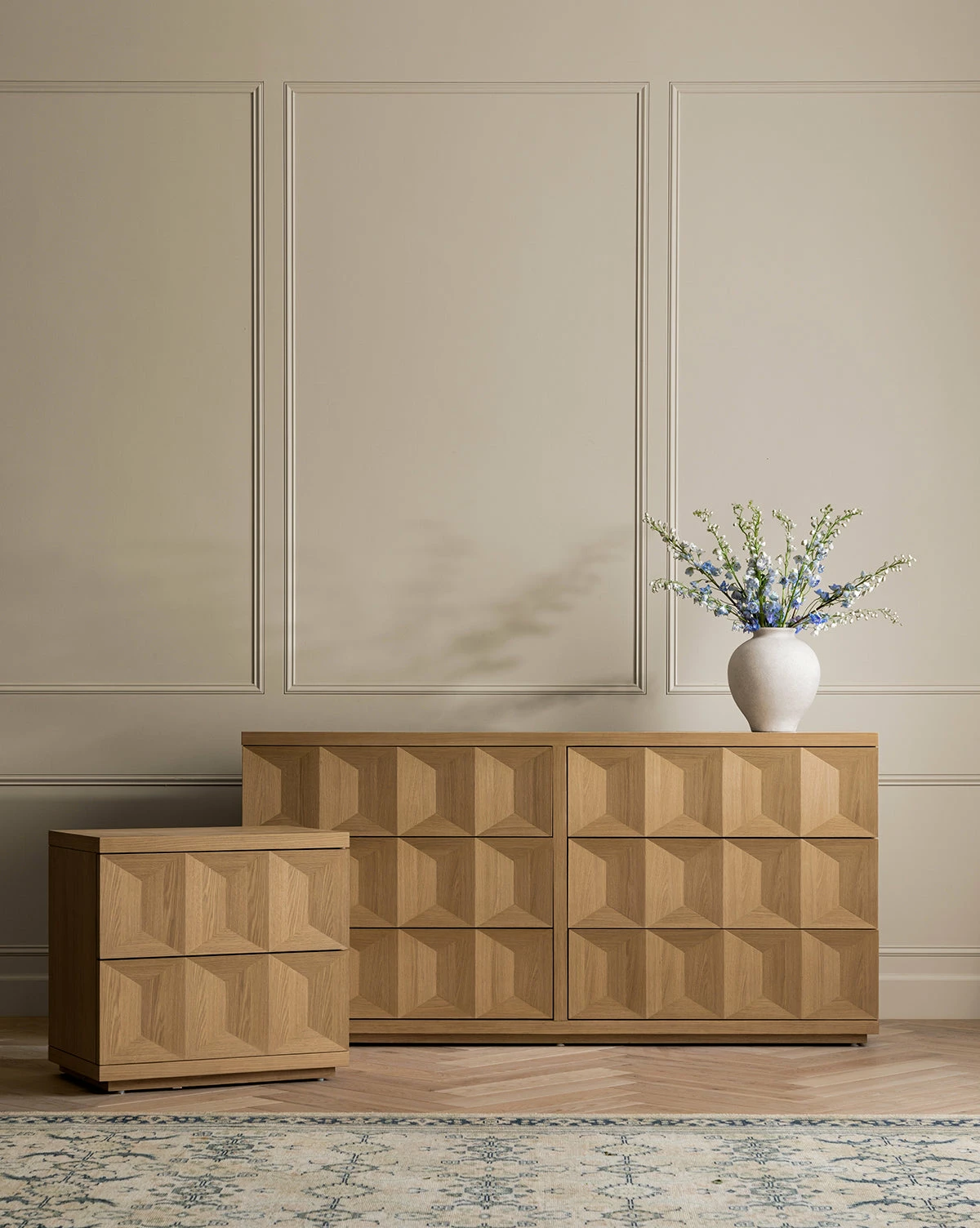 With a blend of geometric and organic motifs, our Beacon 6-Drawer Dresser takes a streamlined approach to visual intricacy. The white oak dresser includes spacious storage that makes it as functional as it is beautiful. In a neutral tone, the dresser is a versatile modern piece for your bedroom styling.