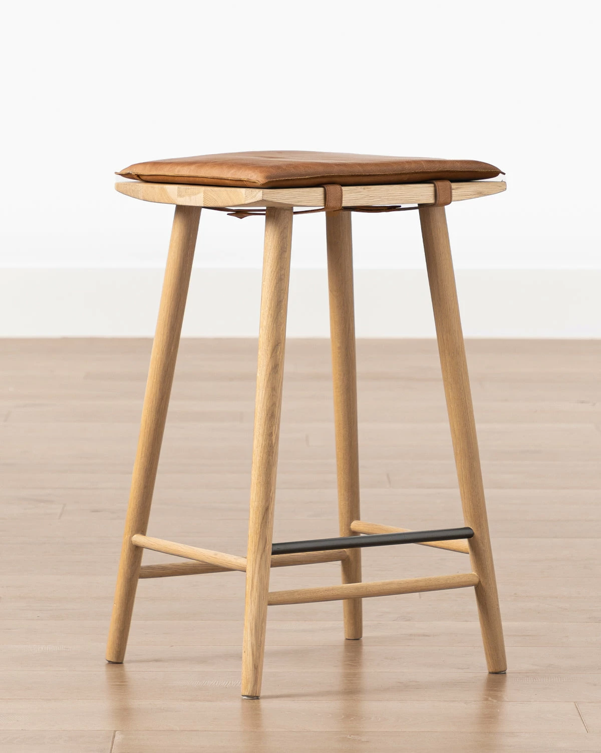 With a unique, no back design, our Beau Counter Stool makes the most of its modern form. From the oak wood legs to the aniline dyed leather seat, this stool brings design to the forefront of your home and finishes it off with a comfortable metal foot rest.