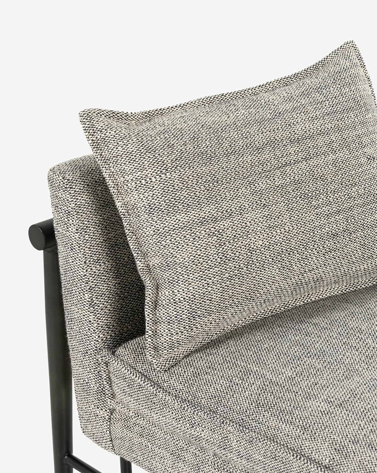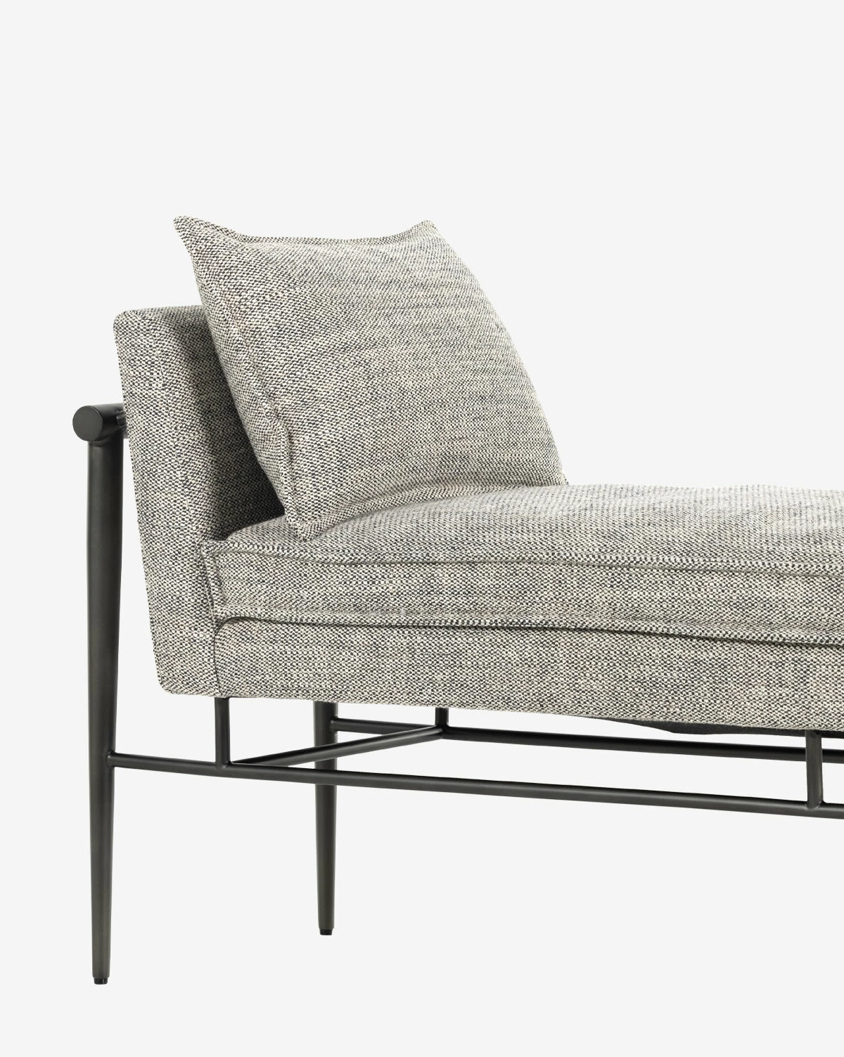 The Bernice Chaise is sophisticated and relaxed. With an iron frame in a carbon black finish, the piece features solid oak arms and beautiful raven-patterned cushions that are soft and comfortable.