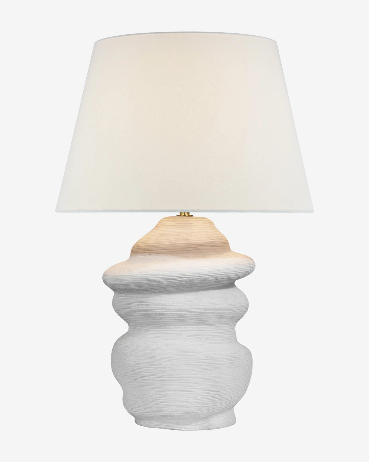 Sculpted from ceramic in an abstract organic shape, the Bingley Organic Table Lamp is characterized by rolling movement and curvature that is stunning and statement making. Finished in a sandy-white reactive ceramic glaze, the piece is entirely unique, with each lamp varying slightly in color and texture. Complete with a white linen shade and dimmable bulb, this table lamp adds a depth of interest to any space.