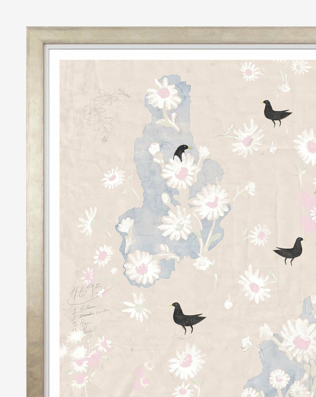 White and pink daisies and small black birds are thoughtfully scattered across this pastel-covered artwork. With a mix of tan and blue, the muted hues of this piece contribute to its calming, whimsical feel. Paired with a champagne-finished wood frame, this artwork will suit any children’s room.