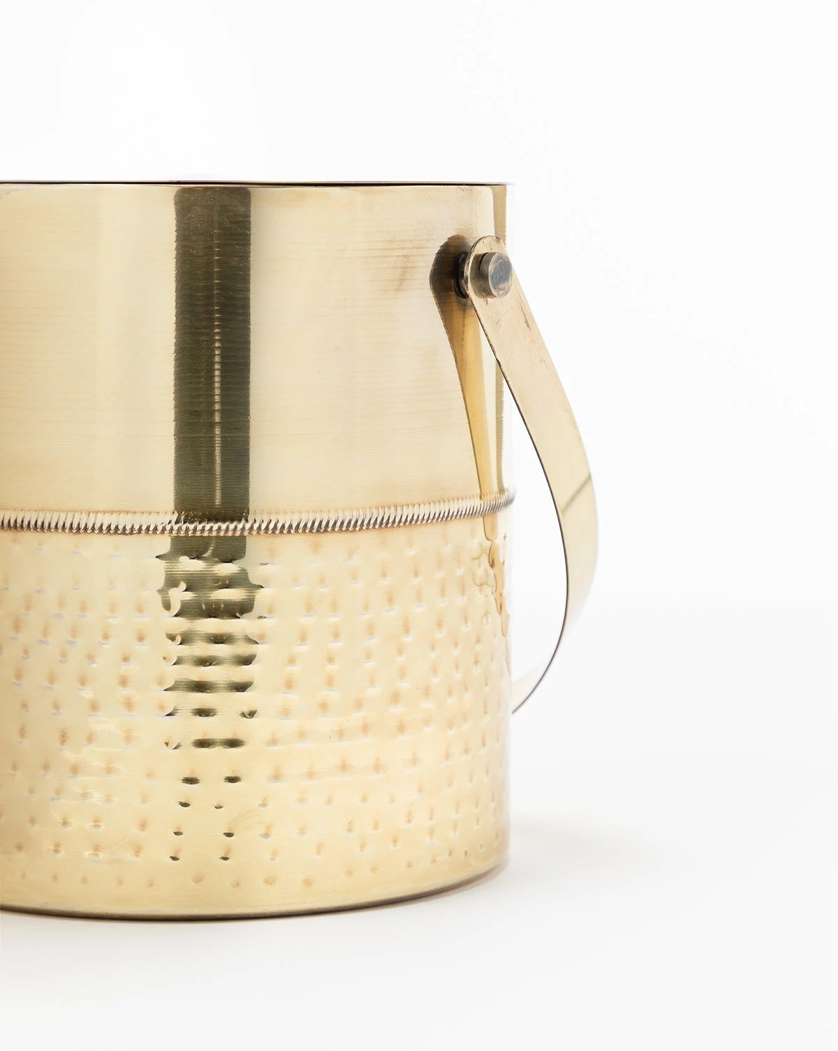 The Brass Ice Bucket is a countertop statement with a bold brass finish. Its textured half goes the extra mile in terms of detail, and its stainless steel body gives it durability. With tongs and an elegantly inset lid, the ice bucket is a timeless addition to your kitchenware.
