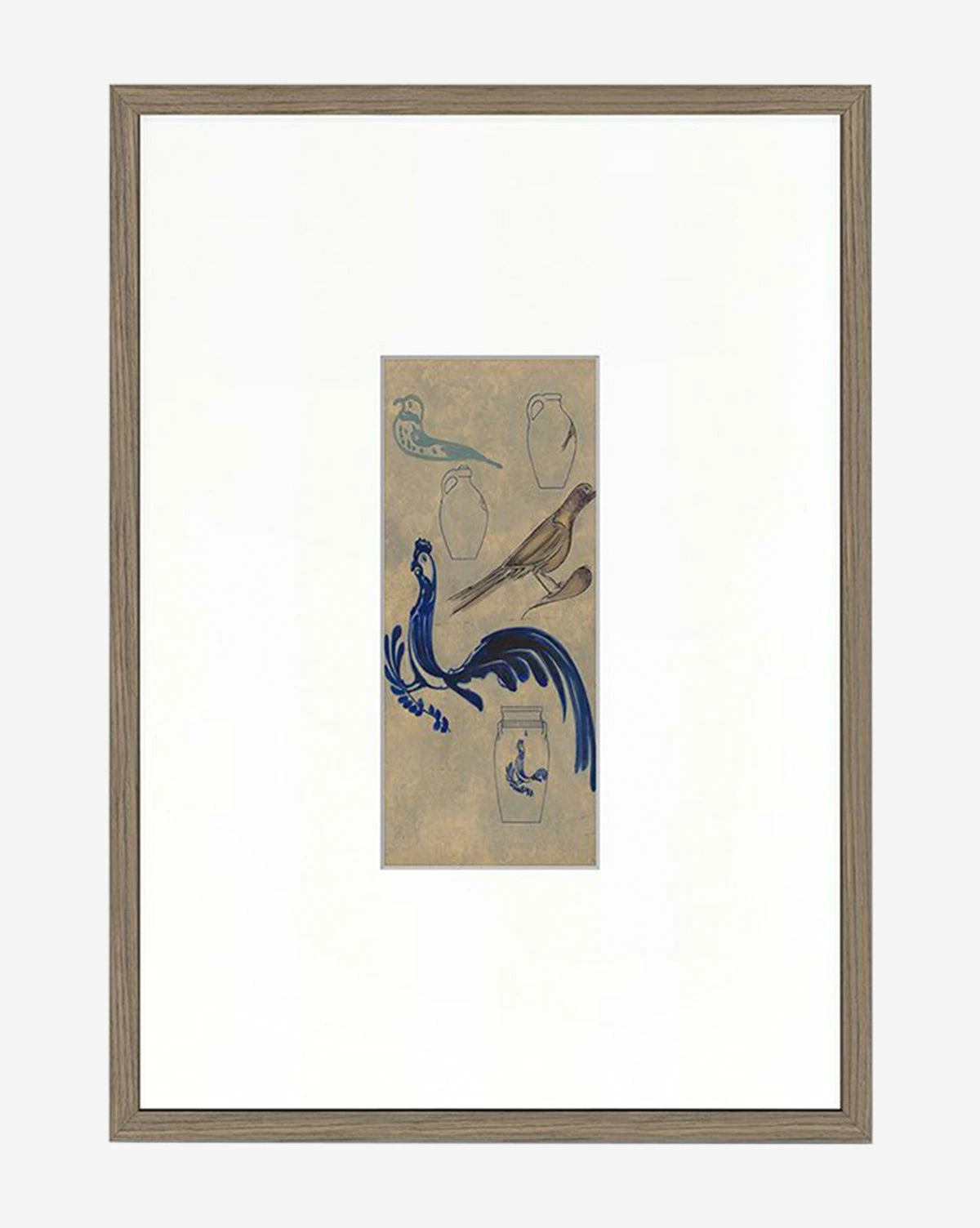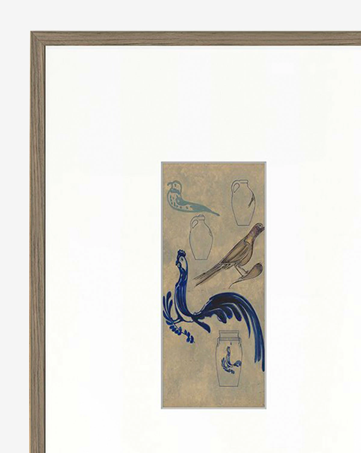 With captivating blue and neutral brushwork, Blue Birds II is a unique collection of detailed birds and pottery with botanical accents. The piece is an archival print on paper that is matted and framed under glass in a walnut wood frame.
