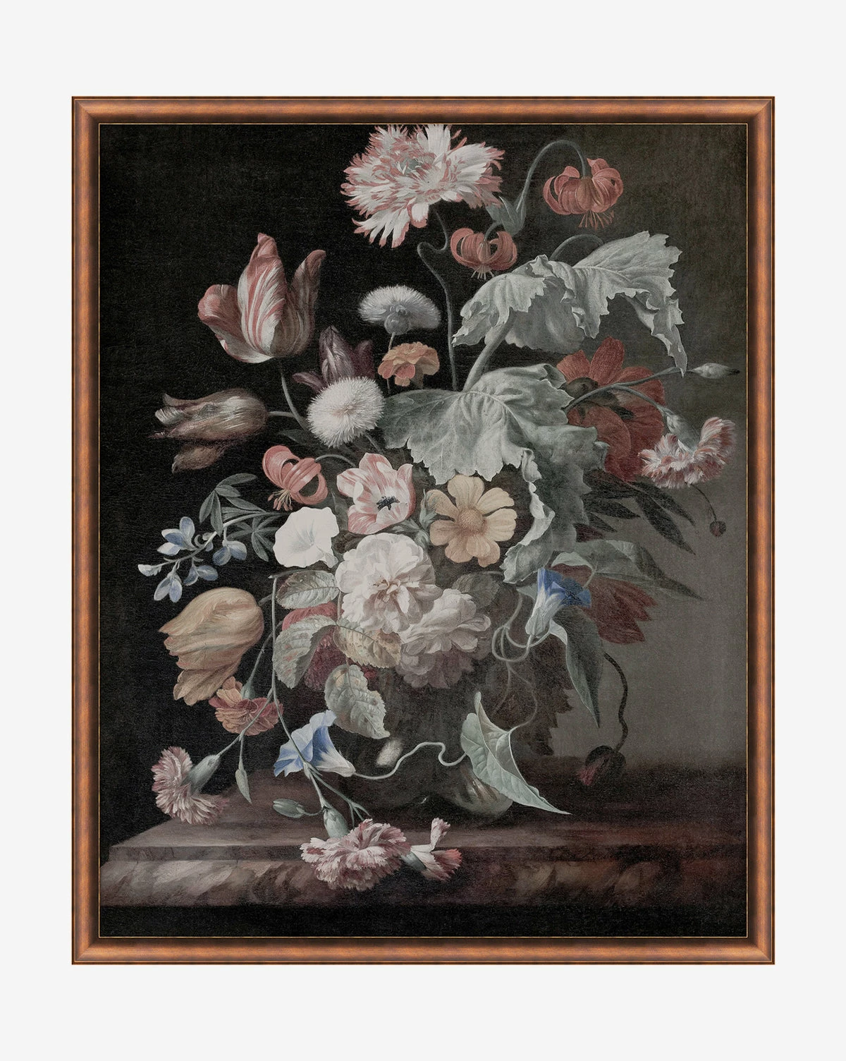 Elegant and moody, Botanical Renaissance brings beauty to your space in the form of a lush vase of flowers contrasted against a dark background. Presented within a bronze-finished frame, this piece brings gallery-quality materials to your decor.