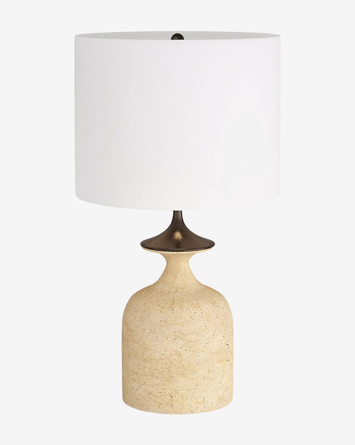 A shapely base brings a sculptural element to your space with our Bridgeport Lamp. Crafted from faux travertine with a sand hue and English bronze steel, the table lamp has a modern feel that elevates your consoles or side tables.