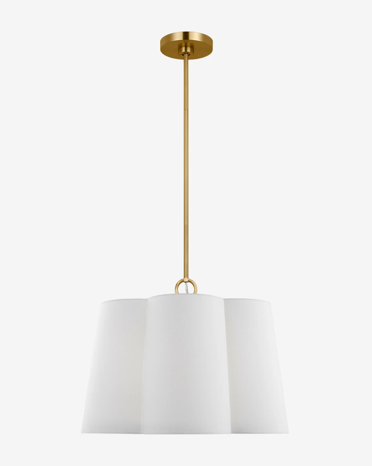 Elegant and classic, the Bronte Hanging Shade is crafted from white silk screen with a steel structure in a burnished brass finish. The scalloped shade creates an approachably nuanced design and brings warm light to any room.