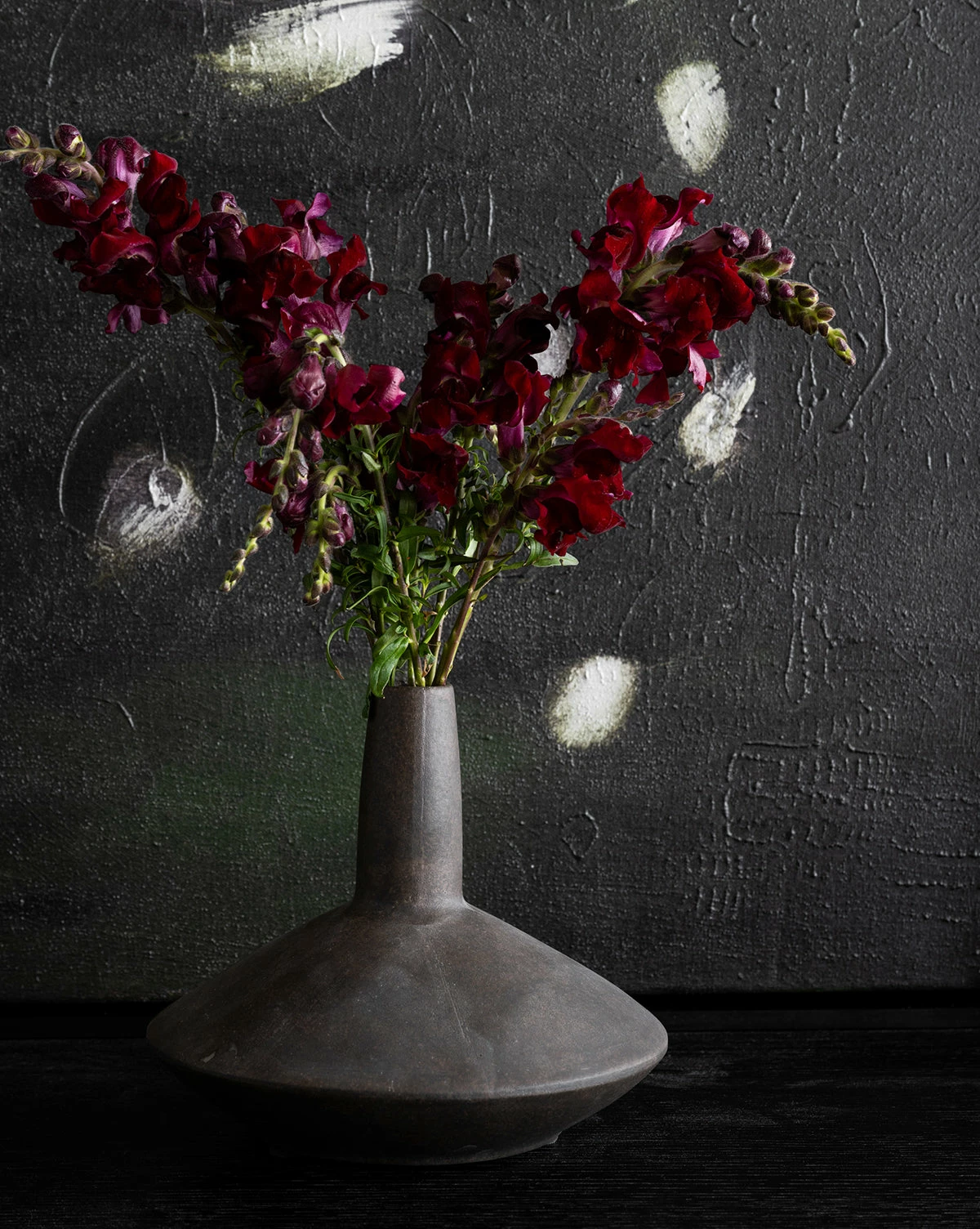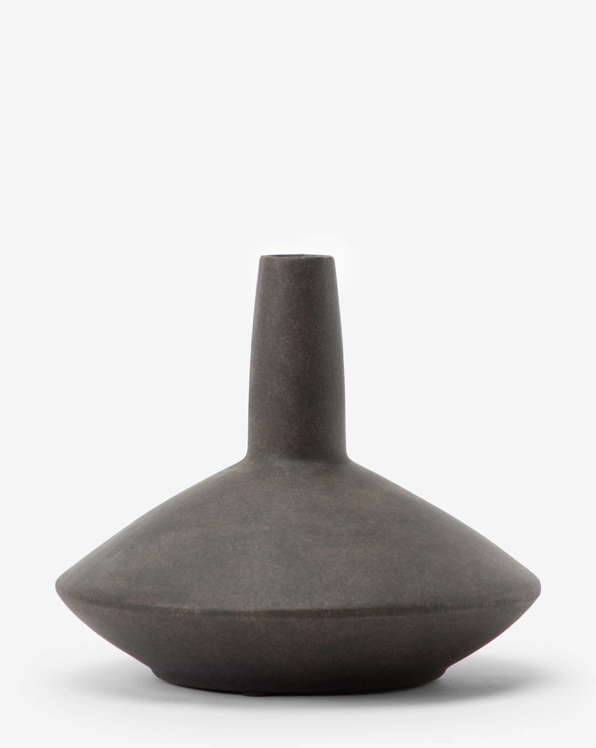Modern and sculptural, the Brown Long Necked Vase has a unique silhouette that emphasizes its wide base. Made from ceramic and finished in a dark brown glaze, this vase makes a statement whether styled on its own or paired with your favorite botanicals.