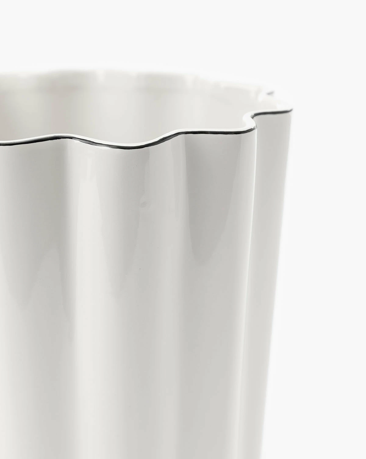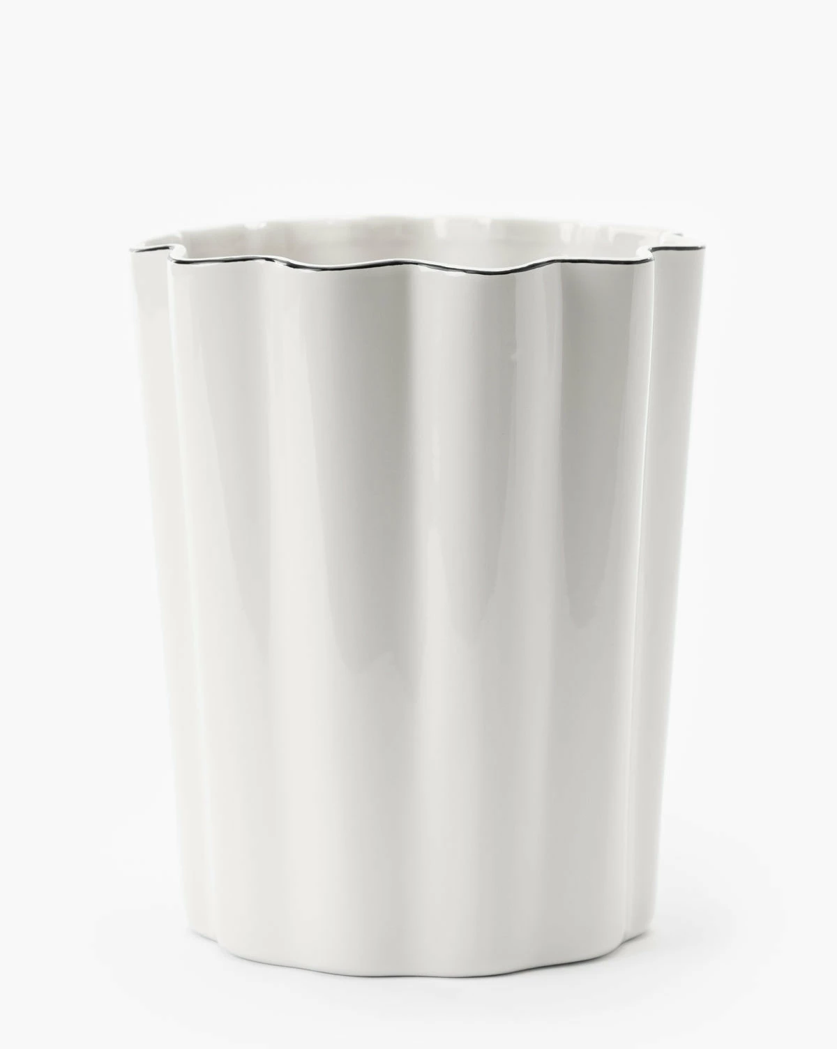 Made from porcelain, the Bryer Waste Bin has a charming and whimsical design. With the dark border on its scalloped edges, this waste bin brings refinement and elevated detail to your bathroom decor.