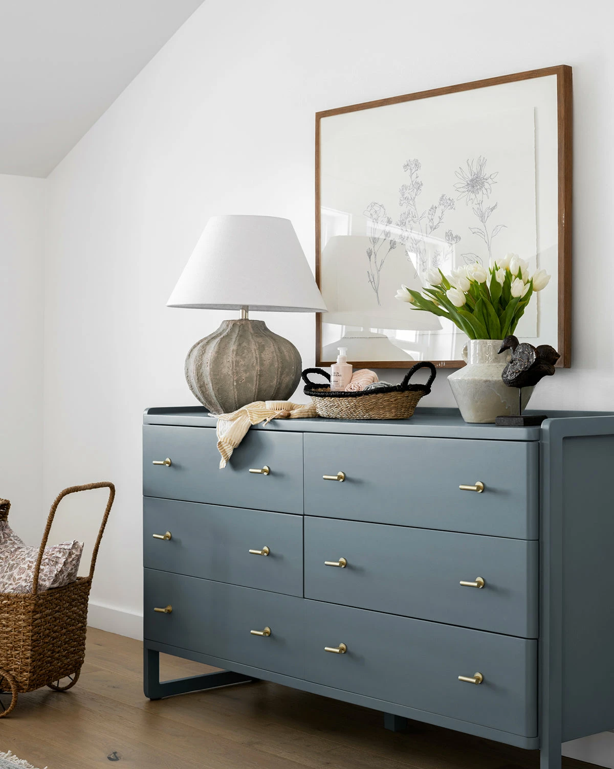 Crafted from poplar wood with a thoughtful maple veneer, the Butler Dresser boasts a clean design in a classic style. This slate blue painted dresser adds the right amount of balance to the palette of your bedroom and is complemented by offset metal handles for a contemporary detail.