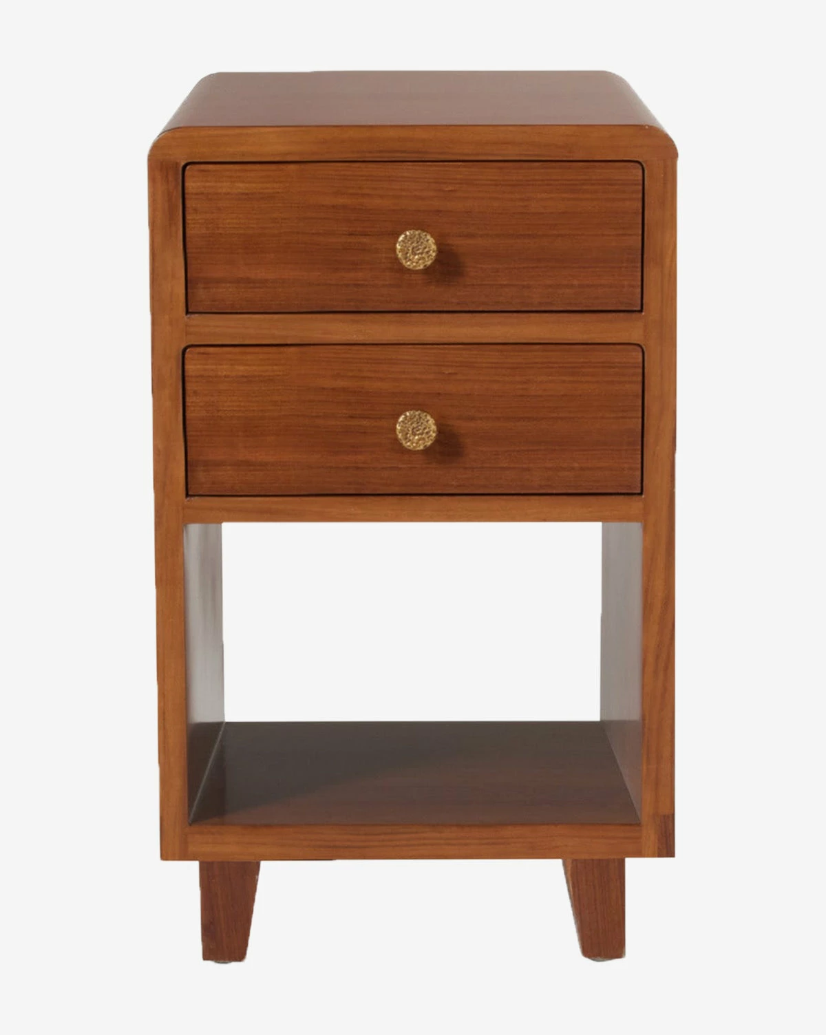In an updated traditional design, the Calperton Nightstand draws the eye with its warm hue and sleek construction. Crafted from teak veneer, this casually approachable design is finished with hammered brass pulls, lending a unique moment of visual contrast.