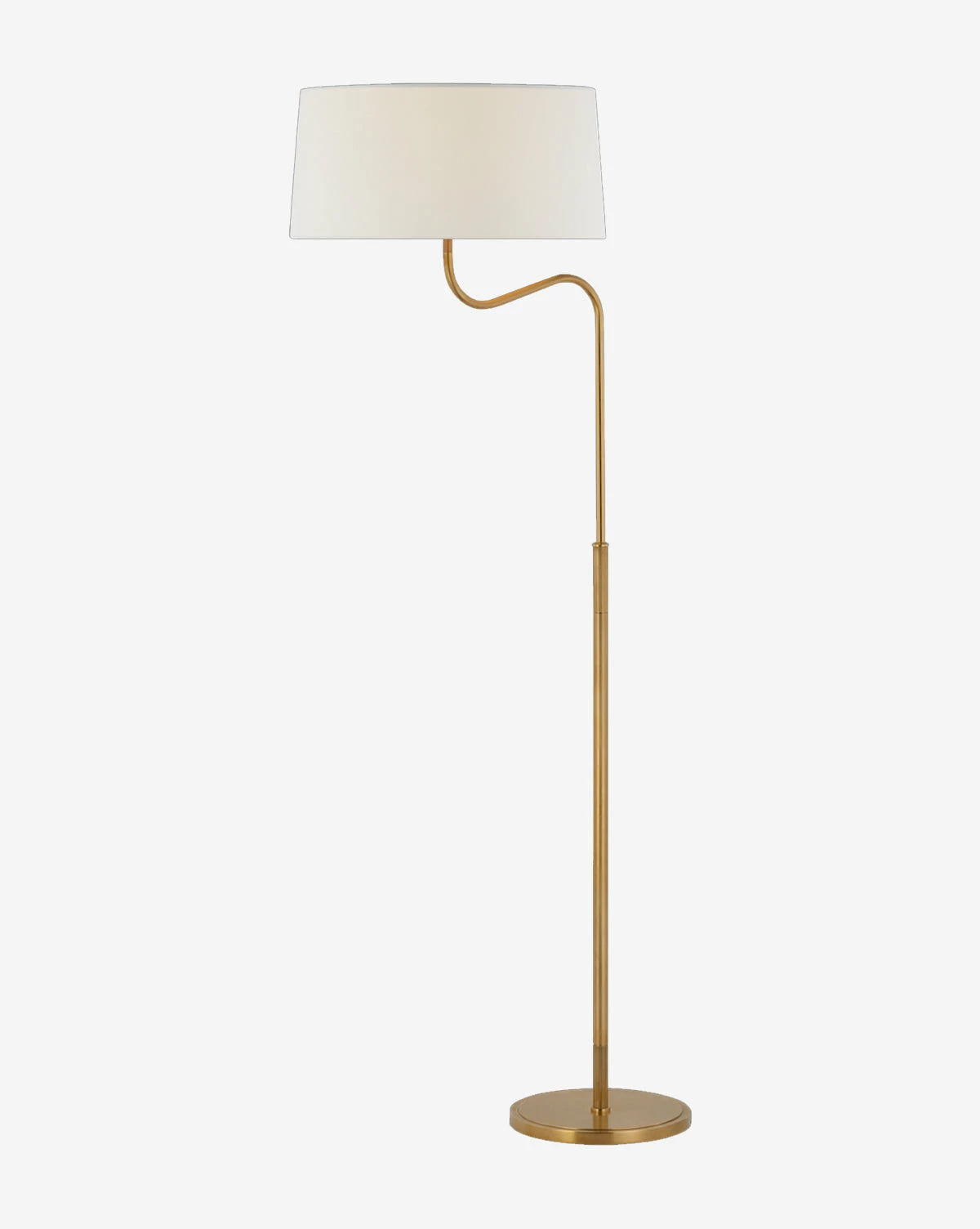 With a classic white linen shade to complement the uniquely curved arm, the Canto Large Adjustable Floor Lamp brings intrigue and refinement to your decor. In a hand-rubbed antique brass finish, the floor lamp is sleek and inviting.