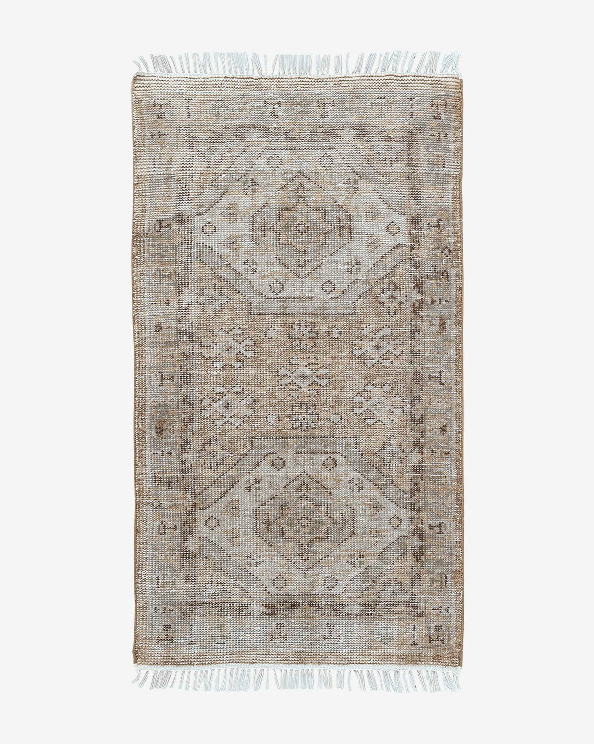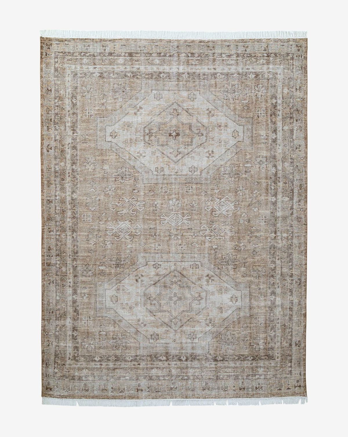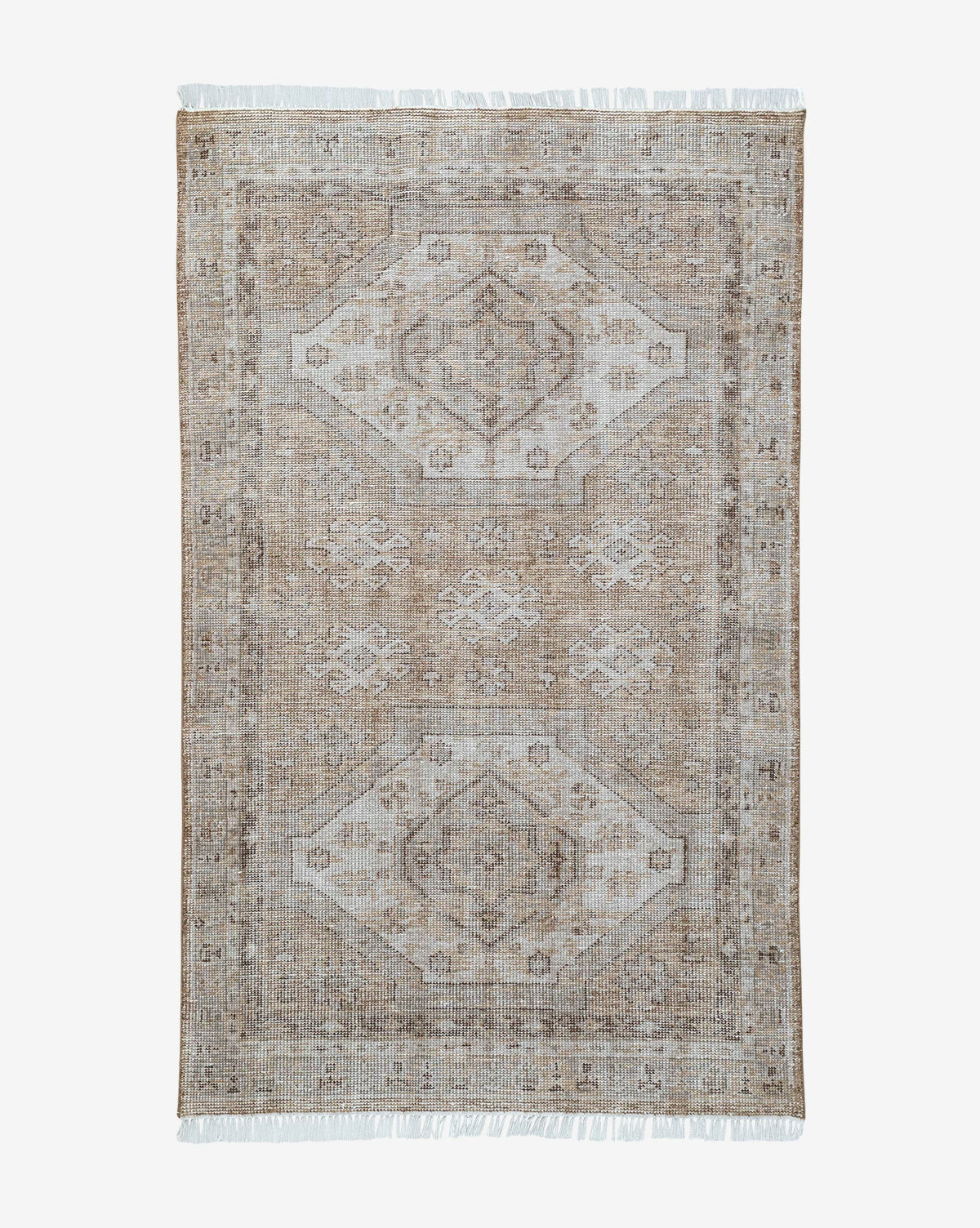 In a traditional style, the Charlot Hand-Knotted Rug has a muted intricate pattern that gives it a vintage feel. The rug is designed to last, made from hand-knotted polyester by skilled artisans. With its short white fringe, the rug is subtly textural and will seamlessly suit your decor wherever it is placed. Â