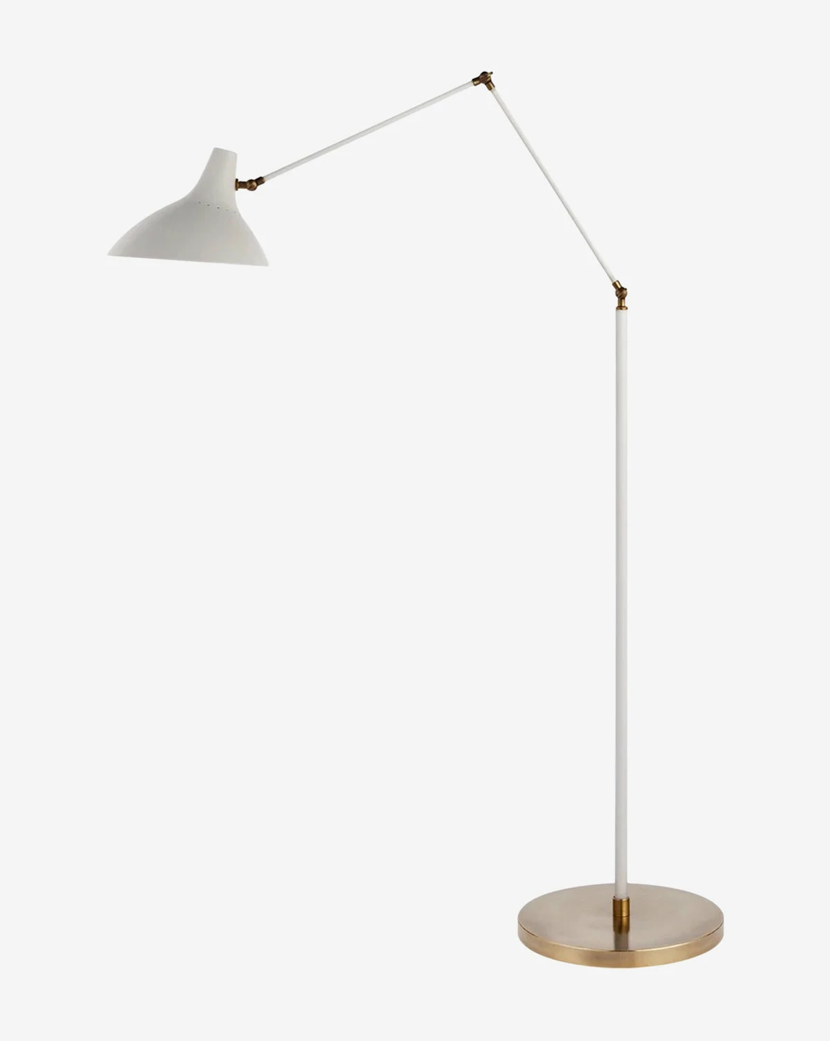 Not your average floor lamp! This functional fixture is a Studio McGee favorite! From top to bottom, it is sleek and modern in either finish. Its unique shade can point light anywhere you need, and that brass base is an element we can look at all day!