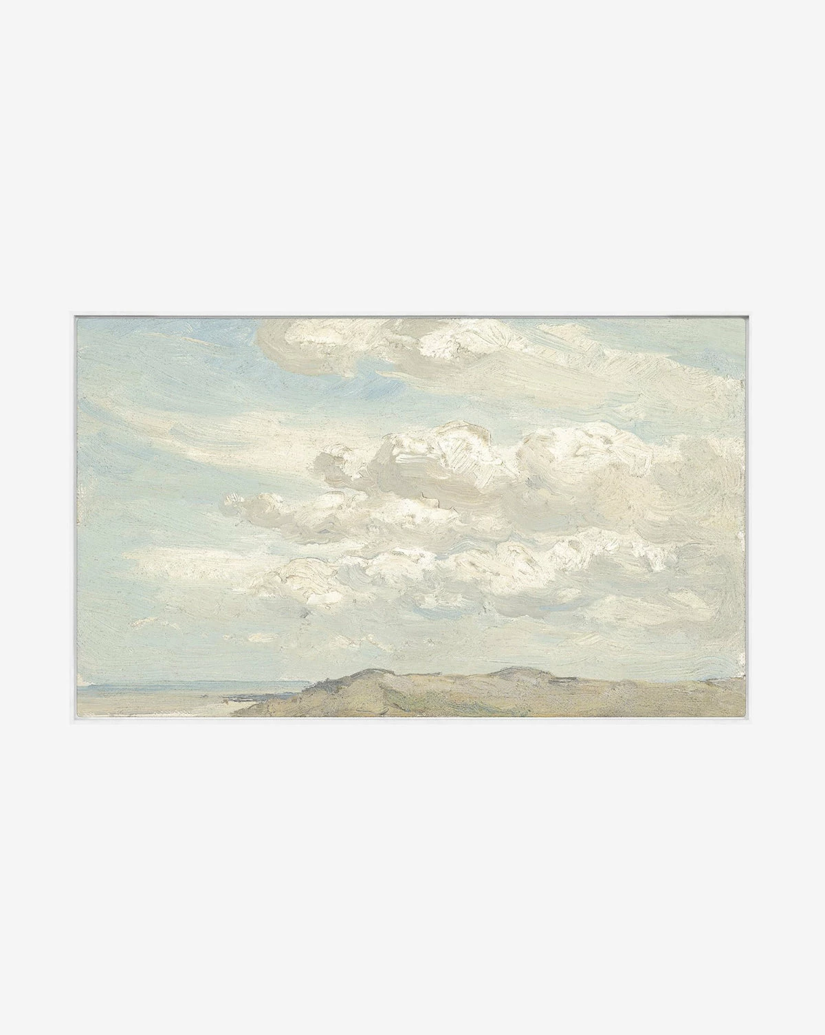 Textural clouds bring Cloudy Dune its naturally whimsical feel. With dunes in the foreground complemented by billowing clouds that highlight shadow and light, this piece brings natural dimension into the home. Painted on canvas and finished with a white wood floating frame, Cloudy Dune adds a gallery feel to the home.