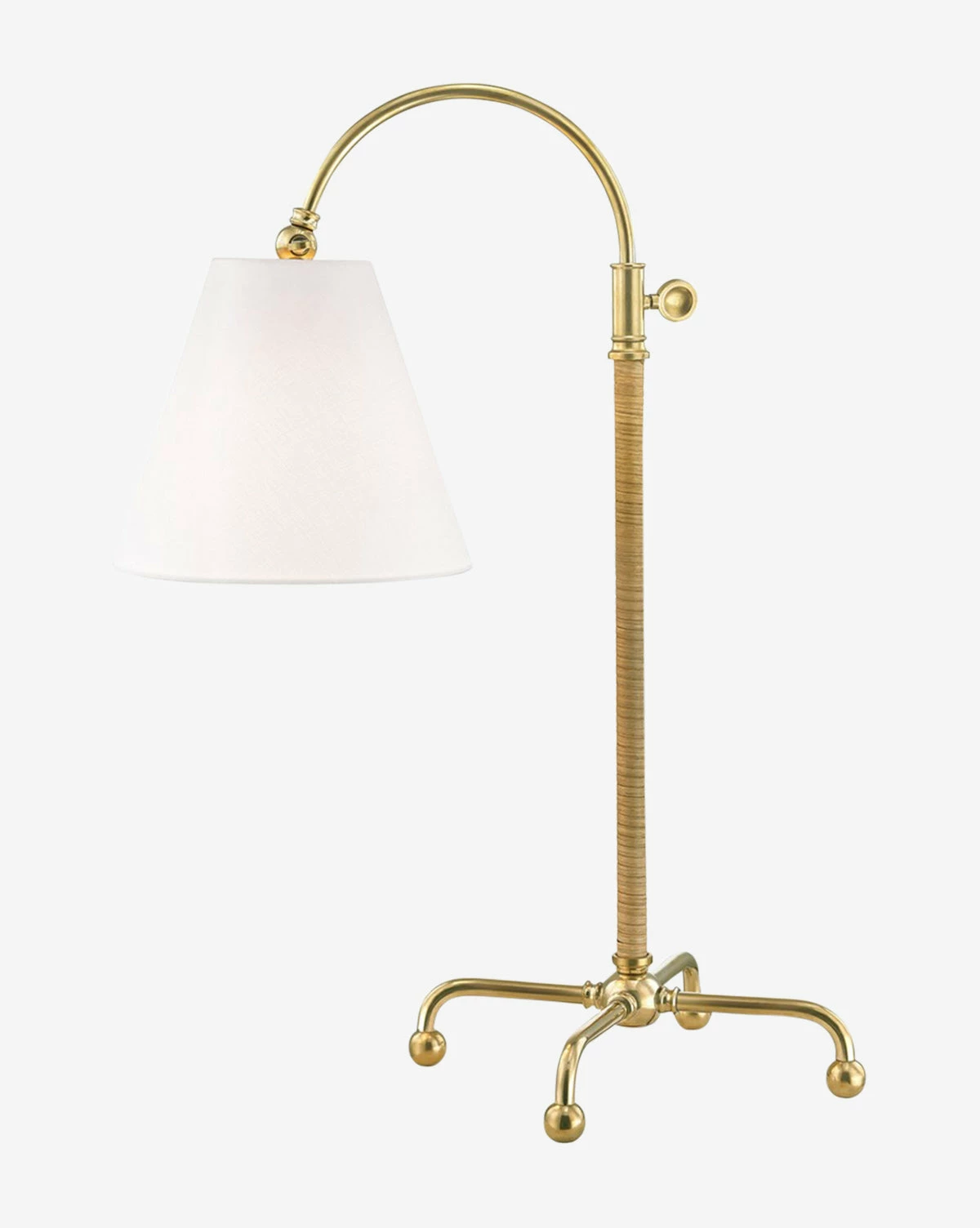 An off-white linen shade is supported by a brass curved arm in the Curves No. 1 Table Lamp. This modern take on tradition makes this lamp a beautiful accent on any surface, and its natural wrapped texture effortlessly lends a subtle, organic touch to the room.