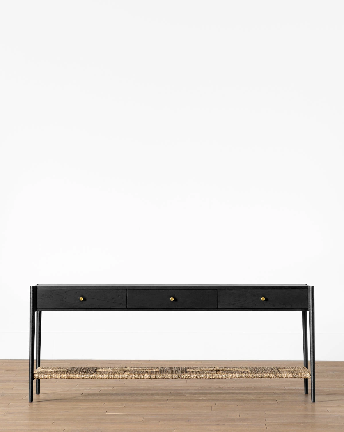 With contrasting materials, the compelling but relaxed Dana Console elevates your space with its thoughtful details. Made from oak in a black finish, the console’s sleek form holds three soft close drawers finished with brass hardware. The woven seagrass shelf provides an open space and a welcome natural texture to your entryway decor.
