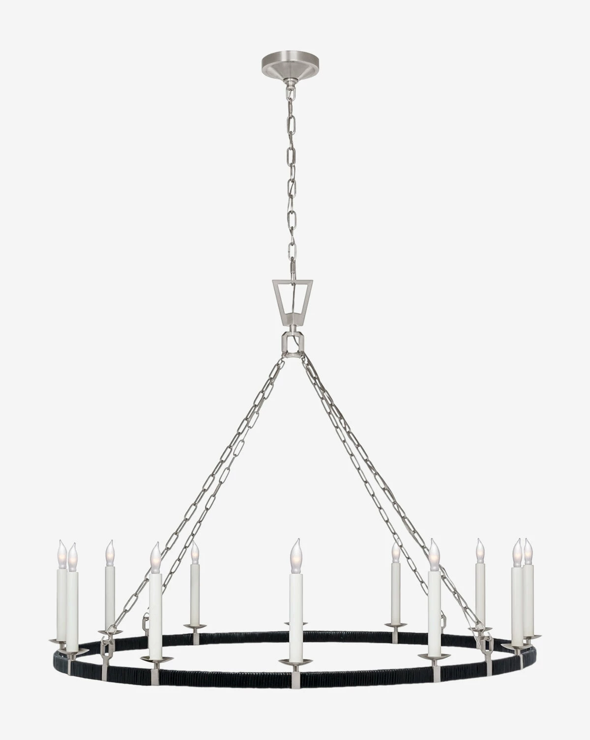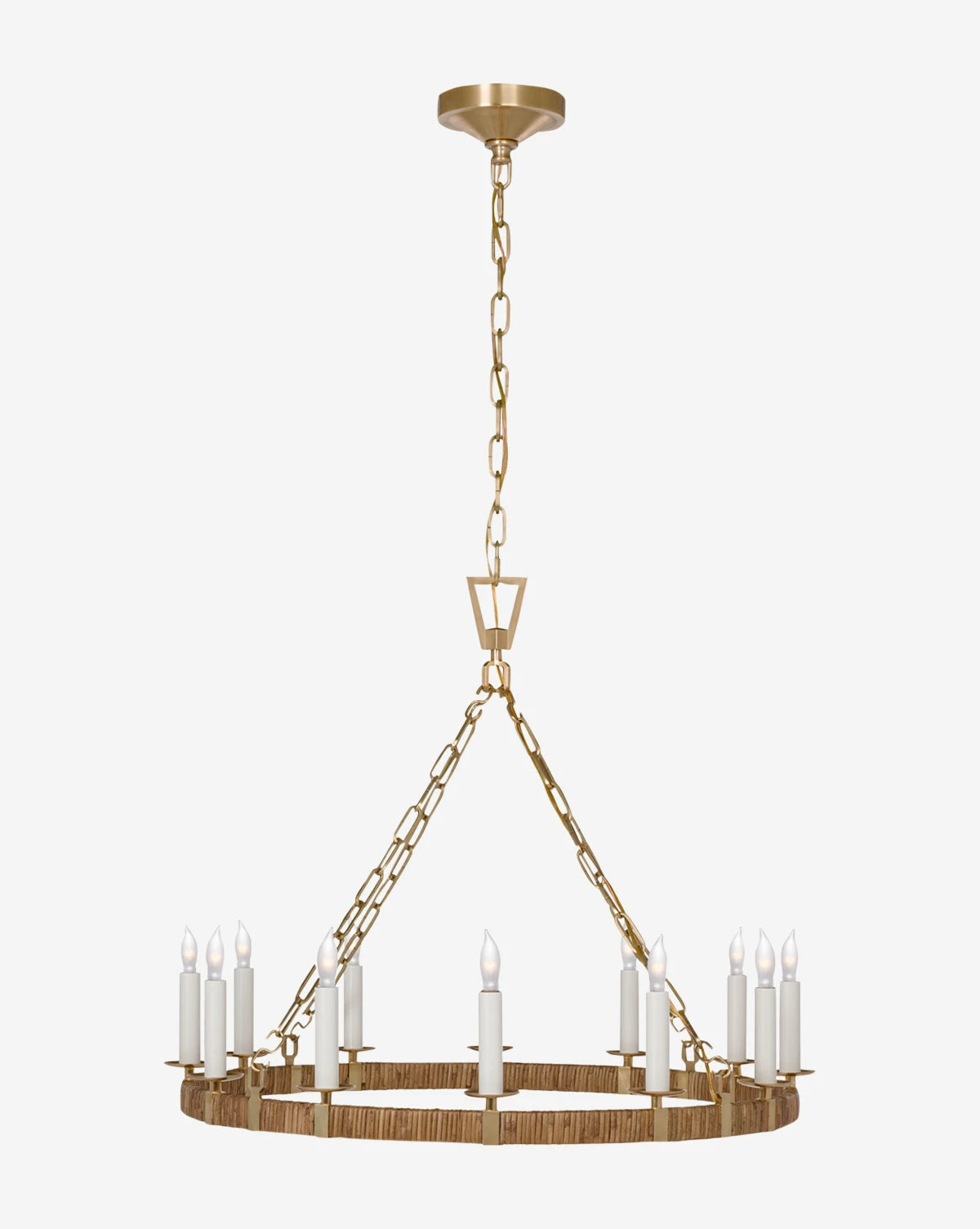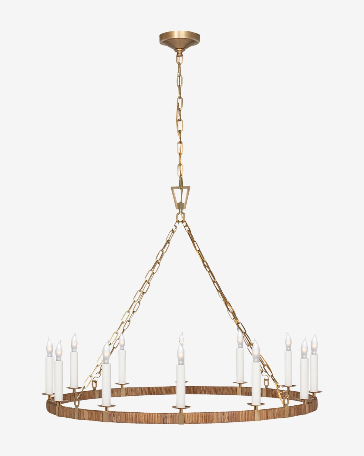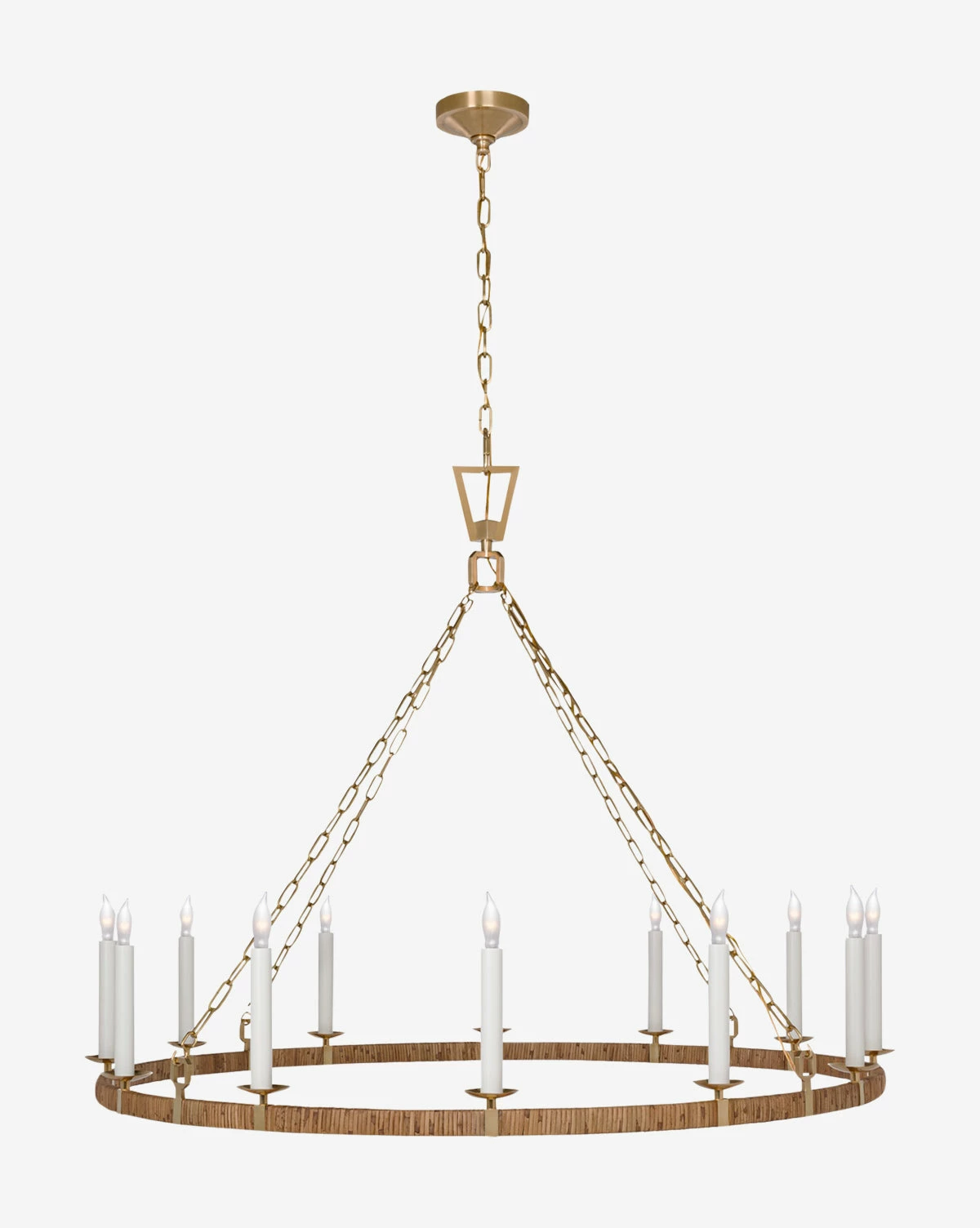 The Darlana Wrapped Chandelier is inspired by the traditional chandelier but given a modern and textural update. Sleek likes and an open frame wrapped in rattan hold candelabra lights, making a contemporary fixture for the entryway, dining, or kitchen area.
