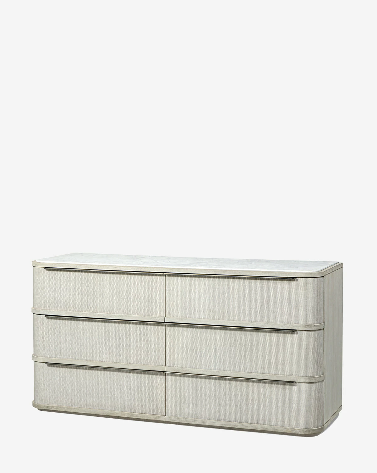 With elegantly mixed materials, the compelling yet neutral Deirdre Dresser elevates your home with its thoughtful details. Made from whitewashed wood with caning on the drawers, the dresser’s marble tabletop brings sleek and sophisticated texture to the piece.