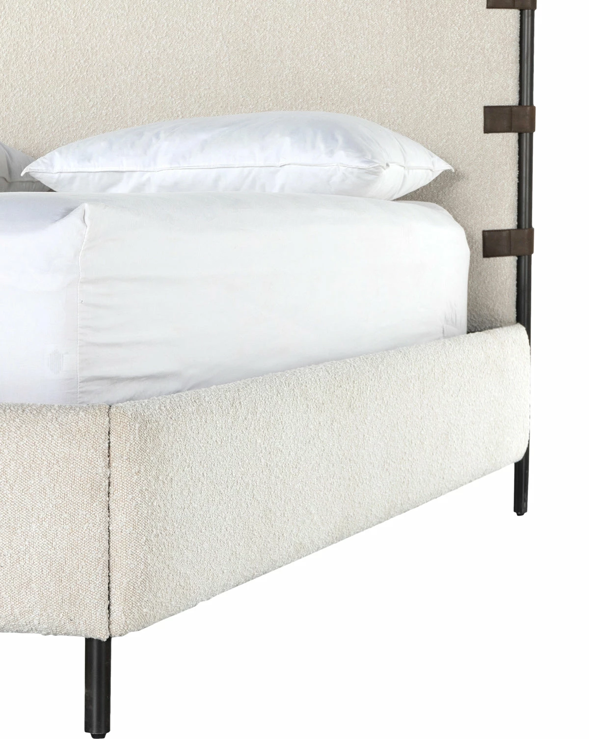 Engaging the senses with a material-rich design, the Depolo Bed blends a cream boucle with rich brown leather straps and strong metal rods. Its high-end craftsmanship gives your bedroom a comfortable feel, adding a bold and intentional quality to the space.