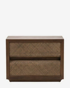 Crafted from walnut veneer, the Dobrev Nightstand beautifully mixes materials in a creative design. The unique structure of the drawers elevates the presence of this warm nightstand, with the dark frame contrasted by the inset woven rattan on the drawers.