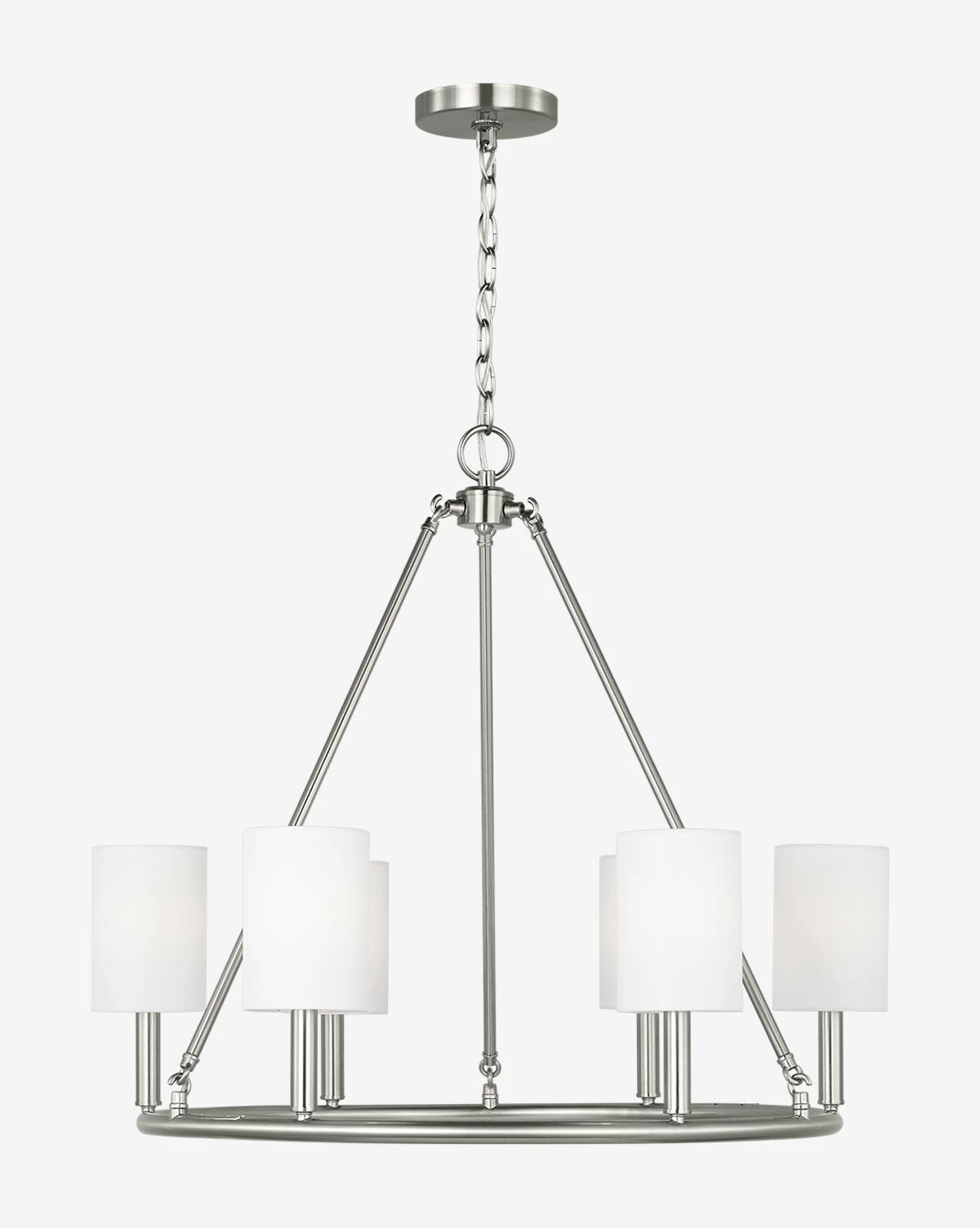The Egmont Chandelier is inspired by the traditional chandelier but given a modern update. Sleek lines and an open frame holding white linen shades make for a beautiful accent for the entryway, dining, or kitchen area.