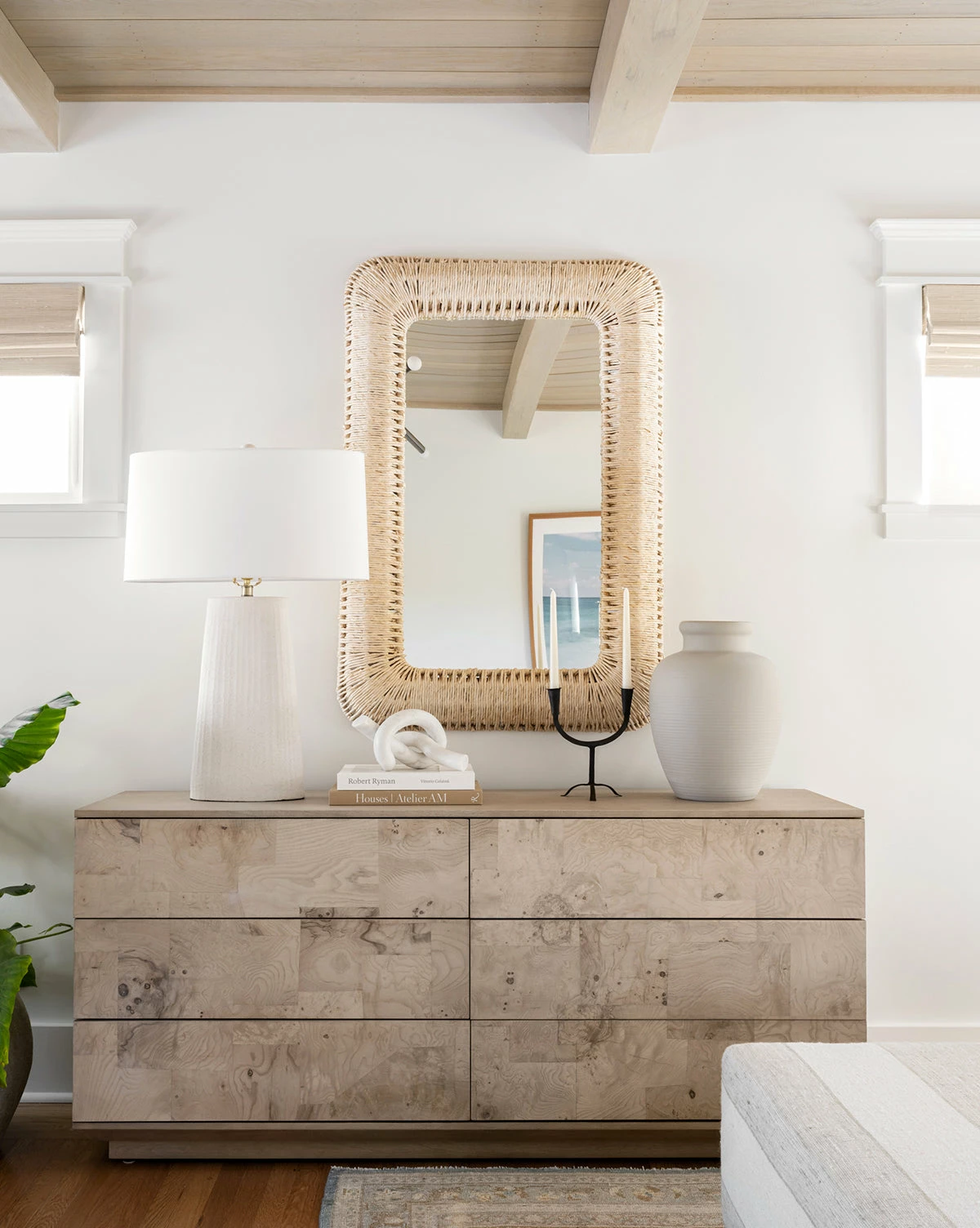 Elevated in both style and design, the Eisley Dresser makes a statement in your bedroom with its white-finished mahogany form and leveled up base. Its bleached burl drawer fronts are laid in a patchwork design, cut and placed by hand, and finished with a push-latch open for a clean, seamless look.
