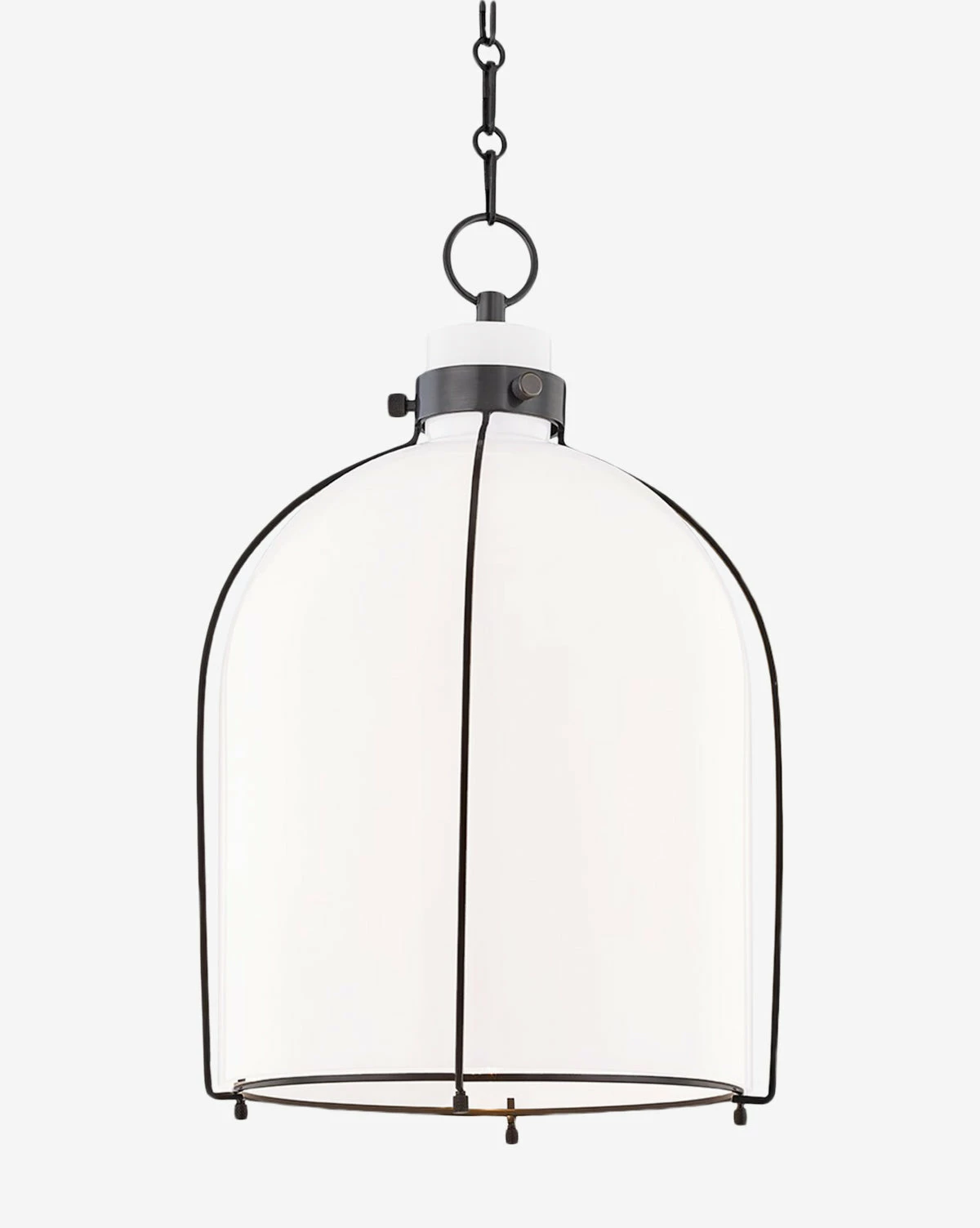 Intentional in every detail, the Eldridge Pendant uses basic forms with elevated details to create visual interest. Its frame holds a glossy white shade in a domed shape, and is complemented by knurled screw accents at the base of the pendant. Complete with an unconventional chain that is both thoughtful and elegant, the Eldridge Pendant acts as a centerpiece in your space.