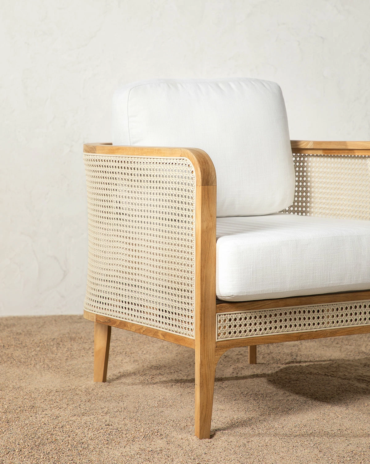Designed with high-quality teak wood, Sunbrella fabric, and high-grade poly wicker, the Elowyn Outdoor Chair is an all-weather lounge piece created to be both durable and beautiful. With stunning caning set in windows of teak wood, this piece has an organic, coastal feel, finished with a complementing Sunbrella fabric cushion and removable pillow.