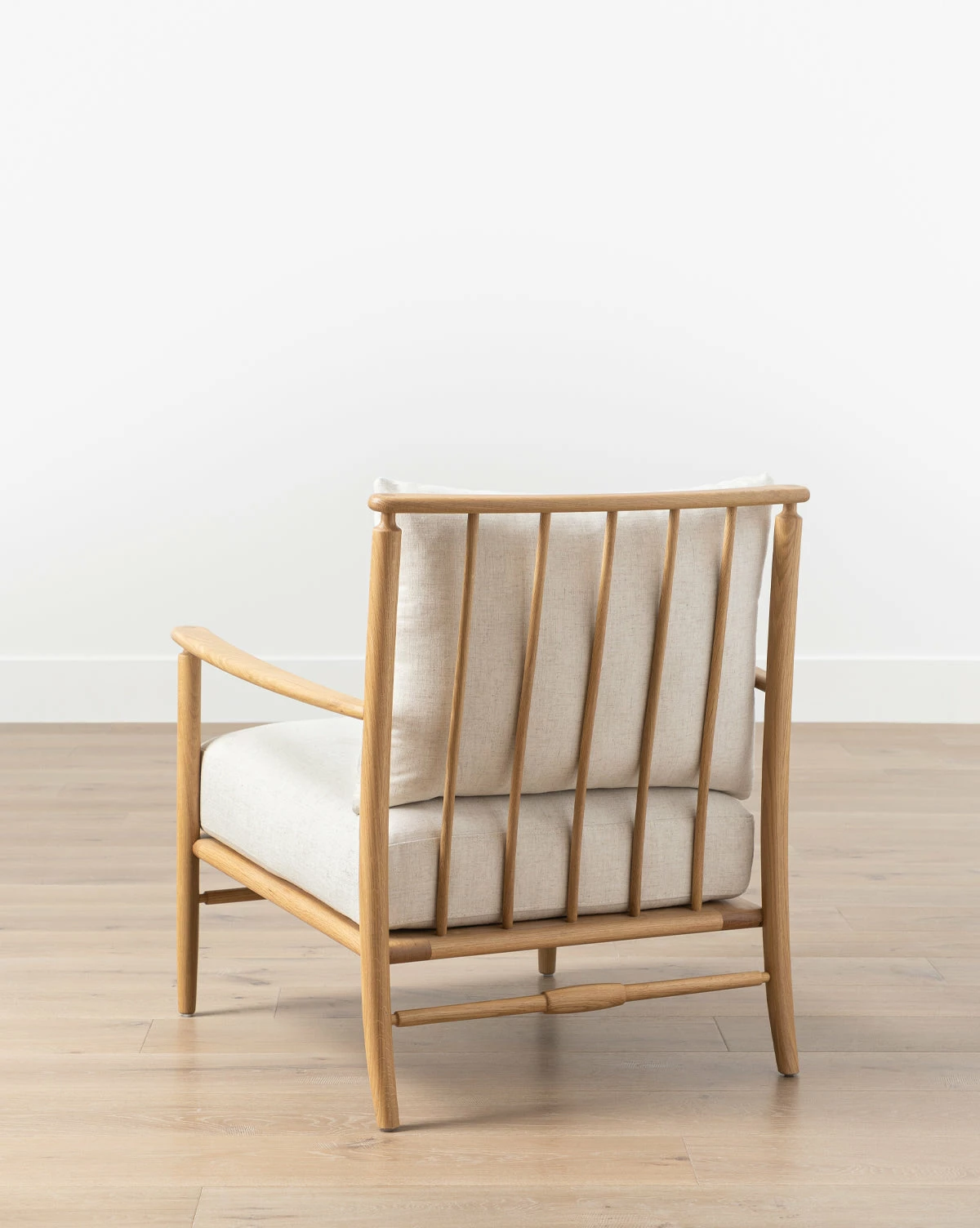With linen cushions in a neutral palette, our Fenwick Lounge Chair brings a comforting rustic yet traditional design to your home. Its elegant frame is made from solid oak wood with a natural finish, supporting two linen cushions to lend comfort and versatility to the lounge chair.