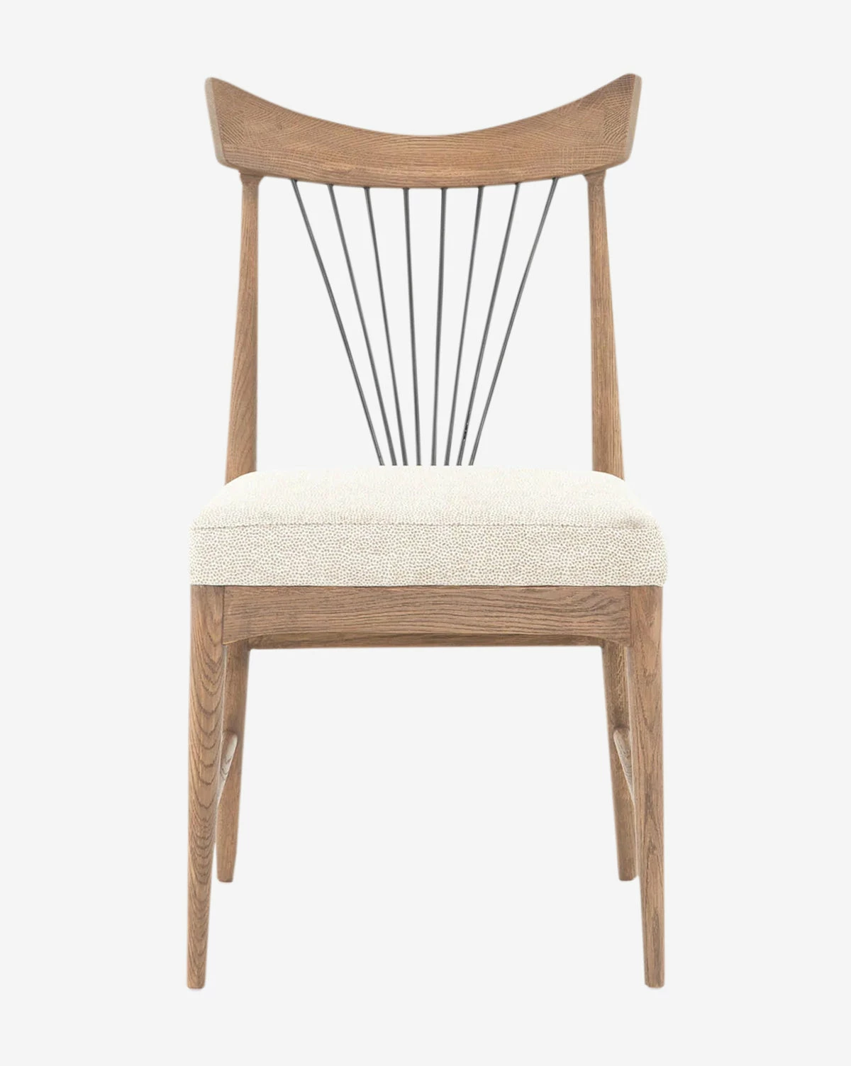 Heavily inspired by mid-century design, the Foley Chair offers eye-catching moments from any angle. Featuring rear spindles of gunmetal-finished iron attached to a honey-finished oak frame, the beauty is in the details from the high-performance upholstered seat to the shapely wing-style back.