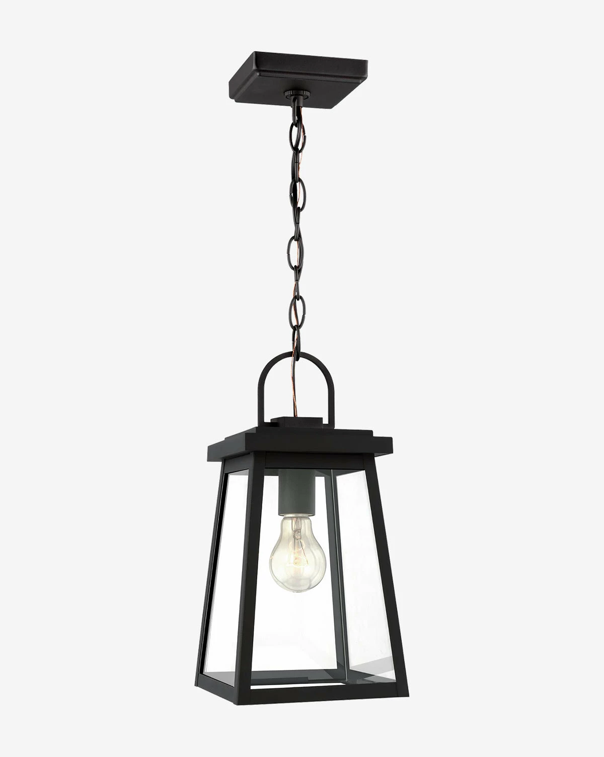 The Founders One Light Outdoor Pendant elevates your outdoor setting with its modern, streamlined form. A refined take on a traditional lantern, the tapered construction of the lantern brings dimension from any angle and warm light to outdoor evening lounging.