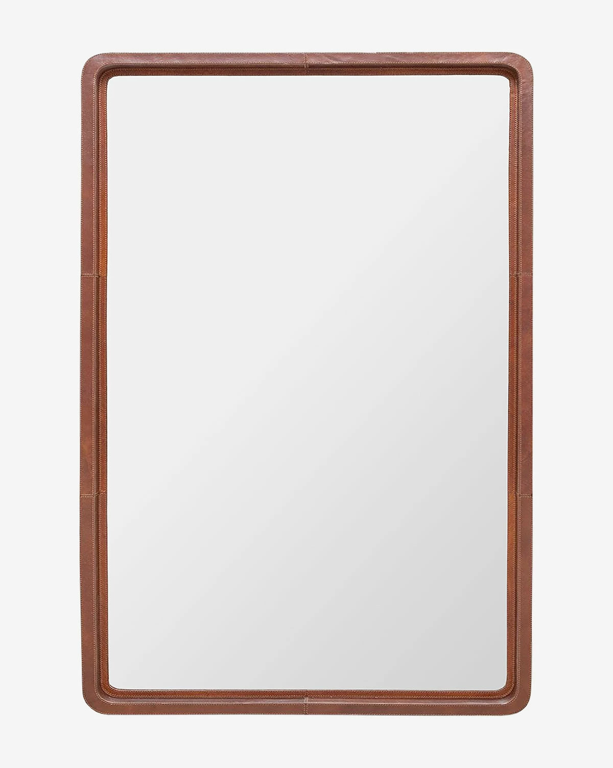 The retro mirror has a full grain tobacco leather with contrast stitching and rounded corners to complete the look. Hang in the home for ultimate sophistication.