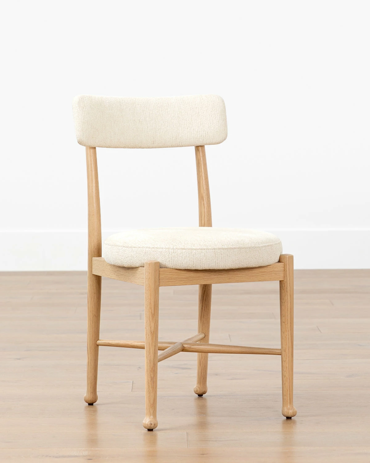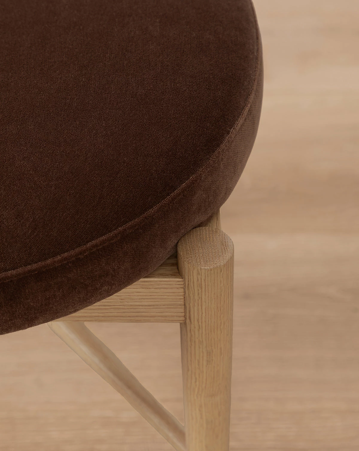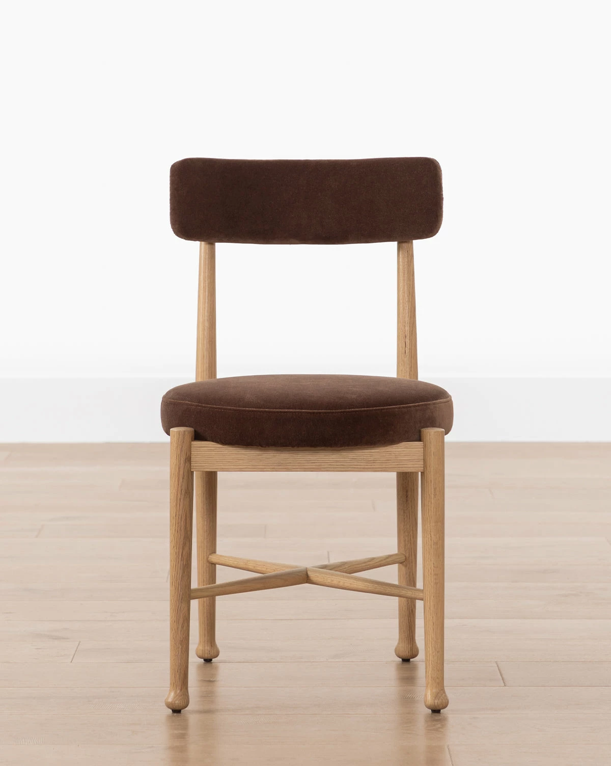 Artfully designed with a solid white oak frame, the Garance Dining Chair has a pitch in its backrest for comfortable seating. In either a parchment crypton or a pecan performance velvet, the upholstered dining chair has a timeless appeal with its curved ball foot and round seat.