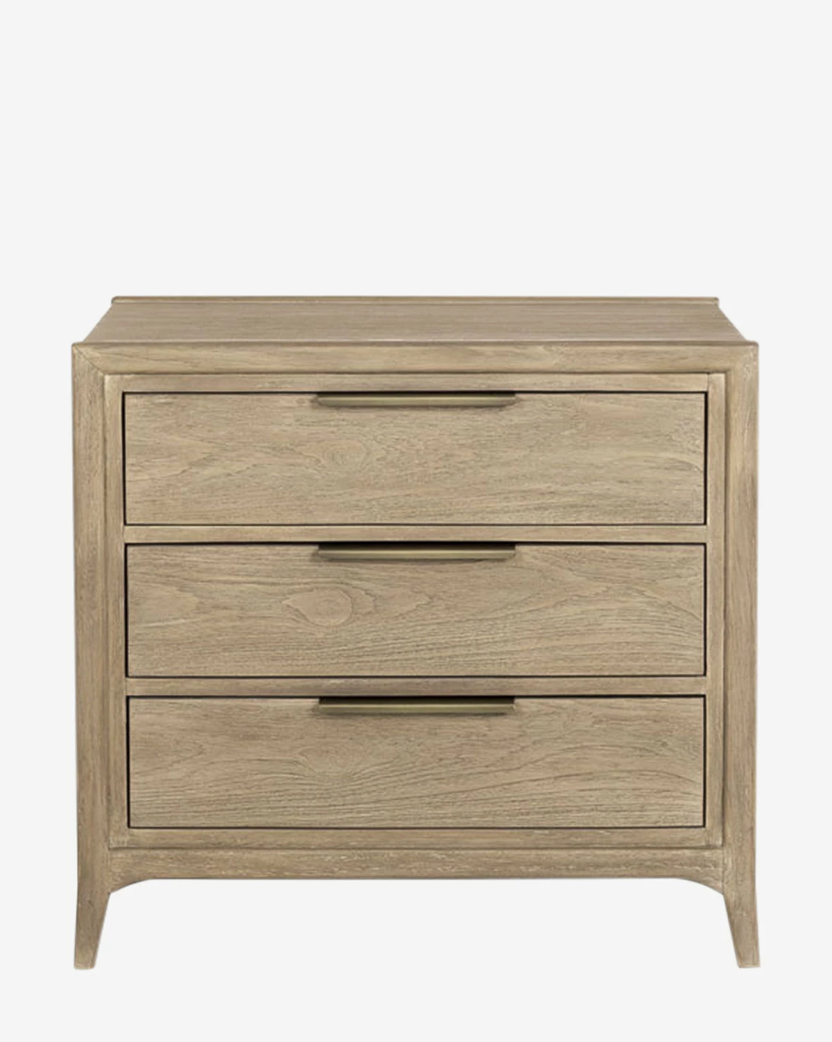 With a subtle warmth from reclaimed teak wood, the Genevieve Nightstand brings natural details to bedroom decor. In a straightforward design, the three drawers of the nightstand are designed to blend in with the whole, accented by sleek bronze-finished handles.