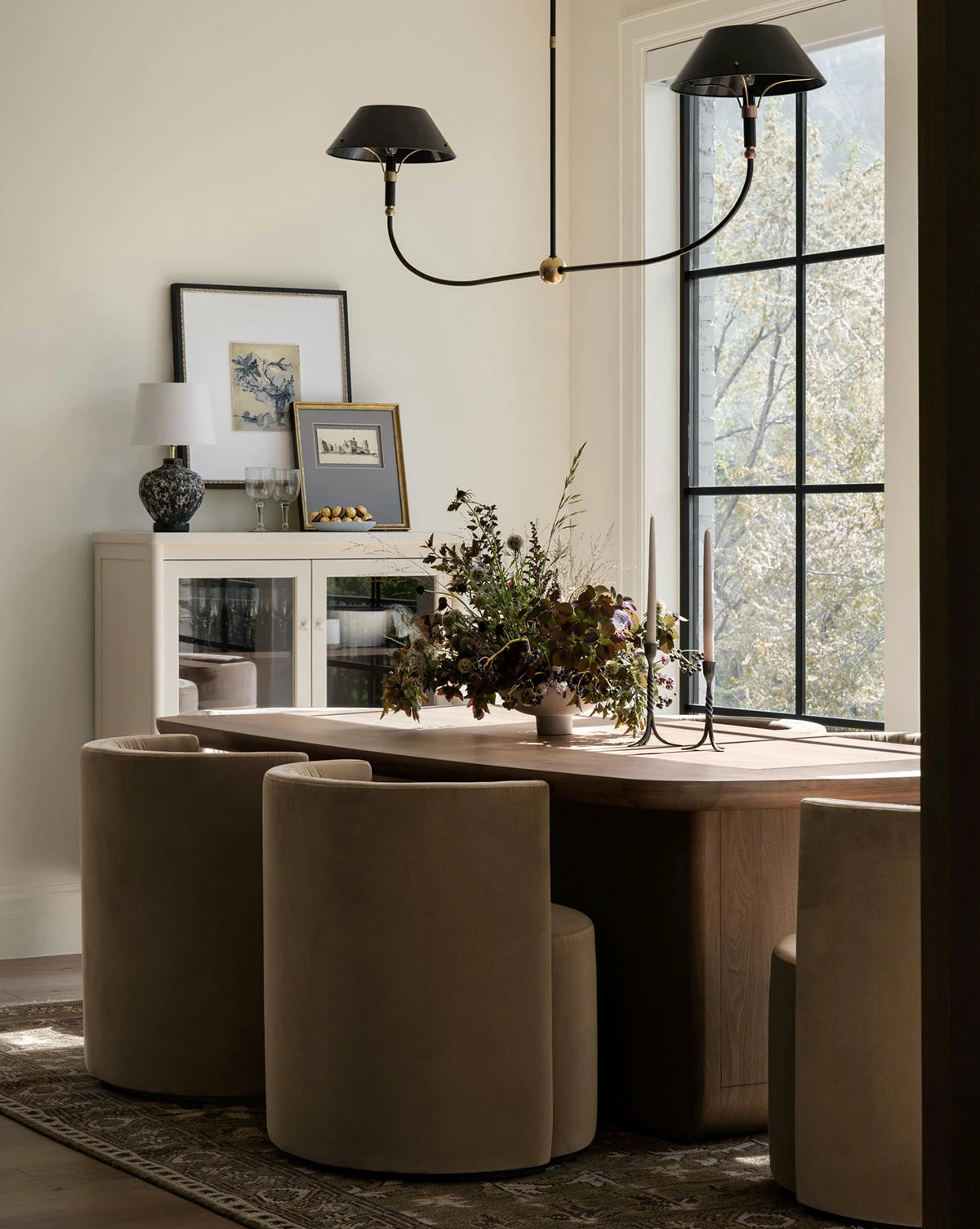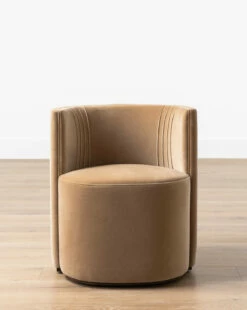 Dramatic and shapely, our Georgina Velvet Dining Chair is designed with subtle art deco inspiration. Its faun velvet upholstery is warm and inviting, while its barrel back and sleek round form provide sophisticated seating in your dining room.
