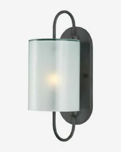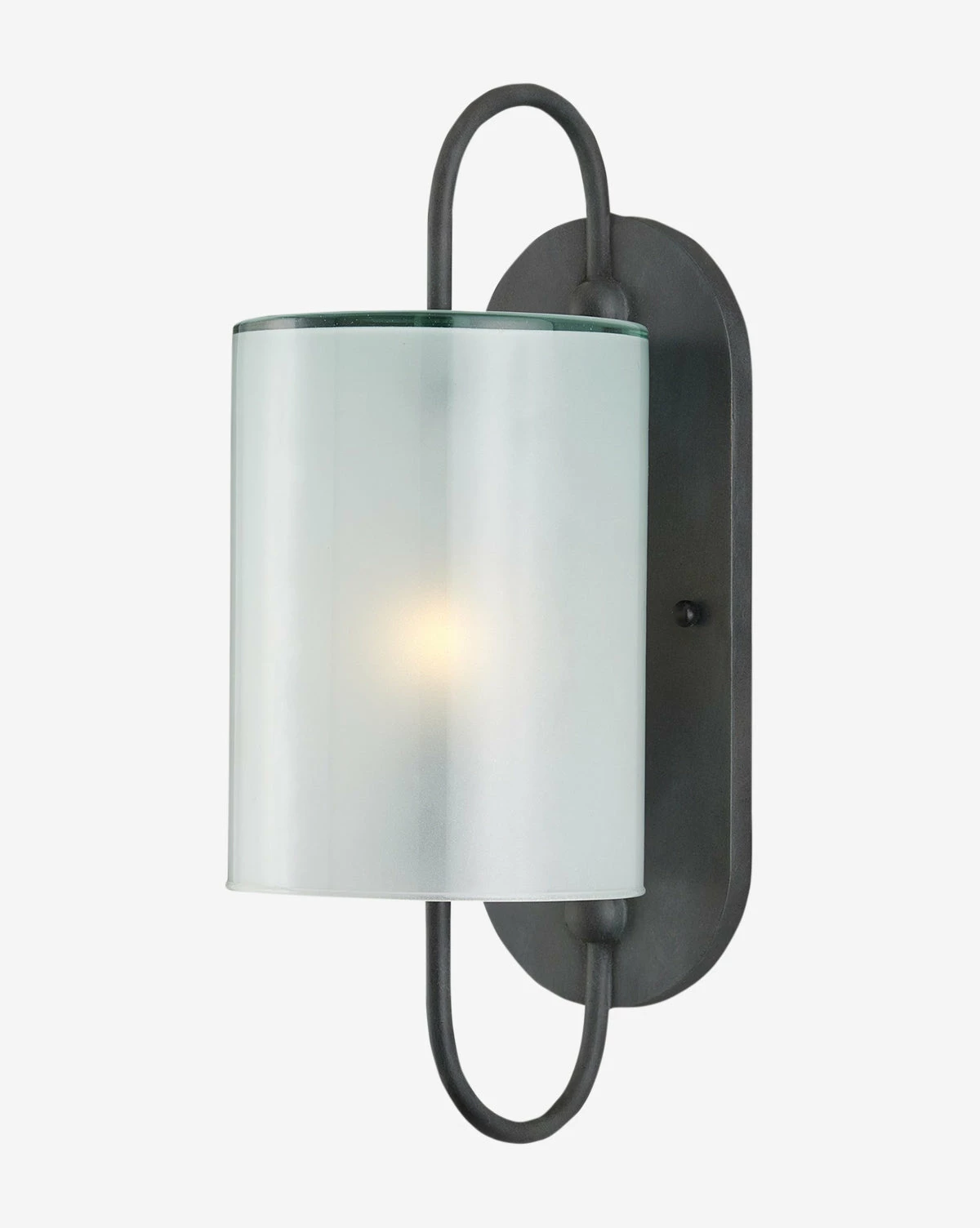 The Glacier Wall Sconce is more than your traditional sconce. Its rounded shape is made from frosted white glass for better-diffused lighting and held by curved wrought iron arms against a round backplate.