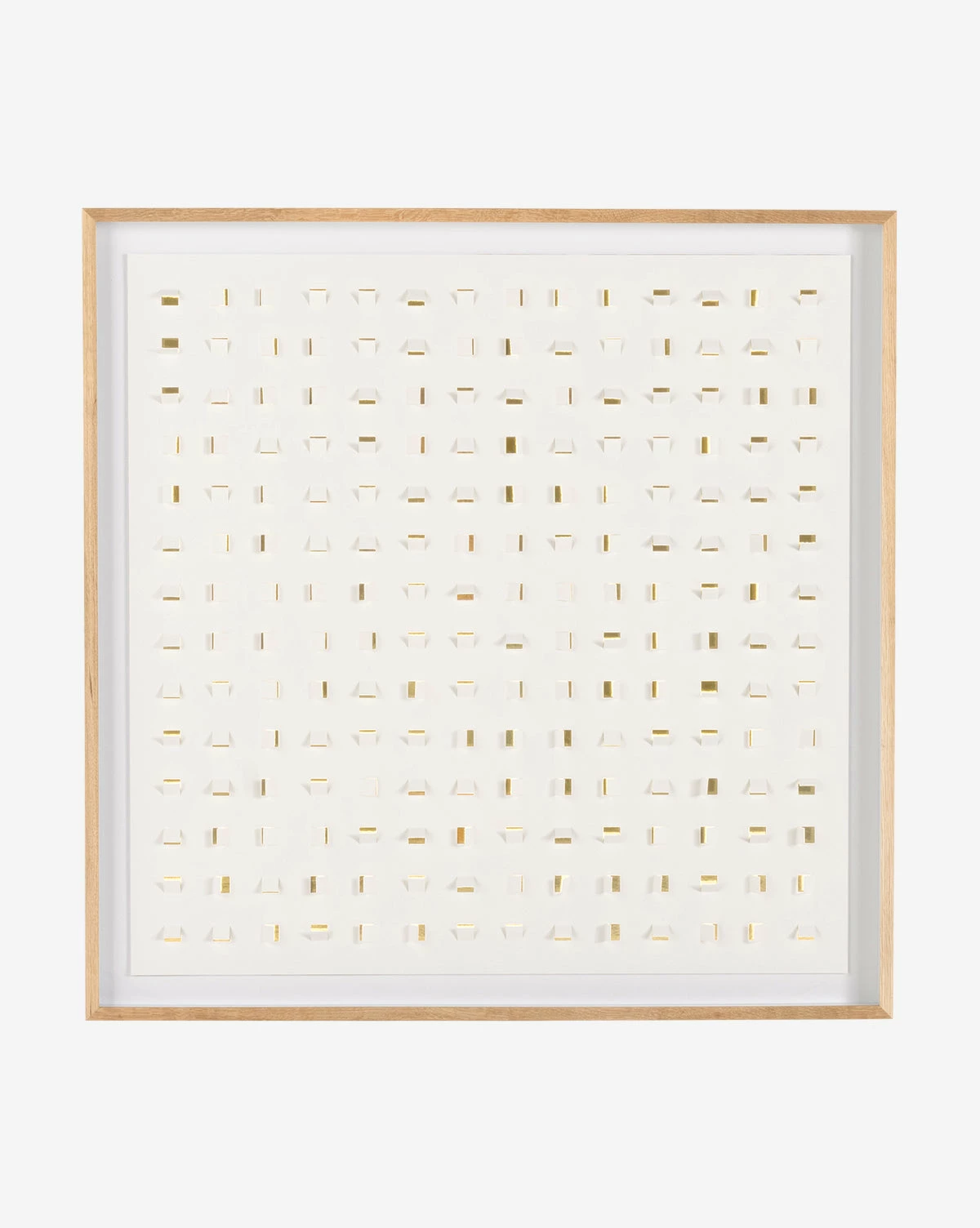 Uniquely contemporary, Gold Proportion is an art piece created with intentionally placed paper cutouts that create moments of color and texture. Displayed in a vertical grain white oak frame, Gold Proportion brings a touch of modernism and texture to your walls.Â