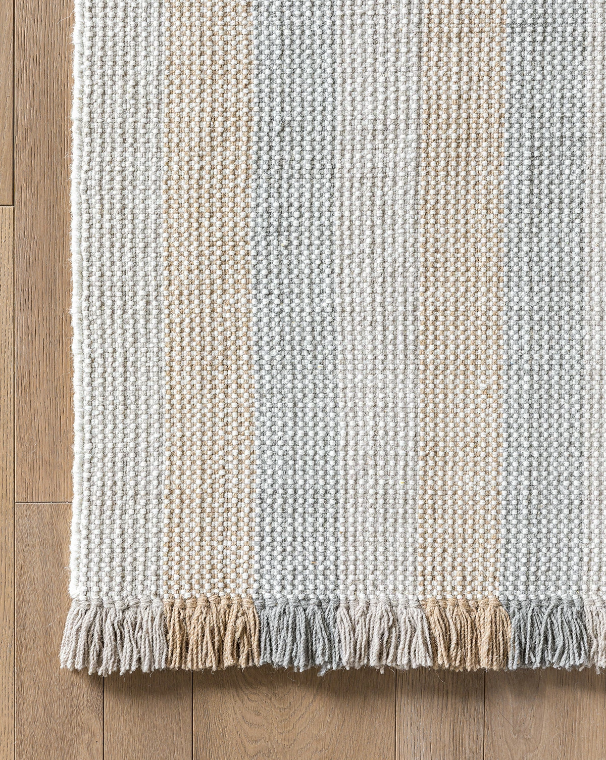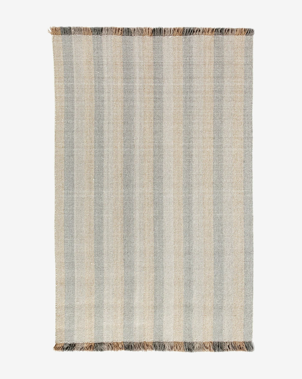 Contrasted tones bring a playful quality to our eclectic Grandby Handwoven Wool Rug. In hazy, muted hues of rose, beige, and gray-toned brown, the rug itself has a handwoven striped design with fringe that extends this pattern in brighter, richer tones of the same palette.Â