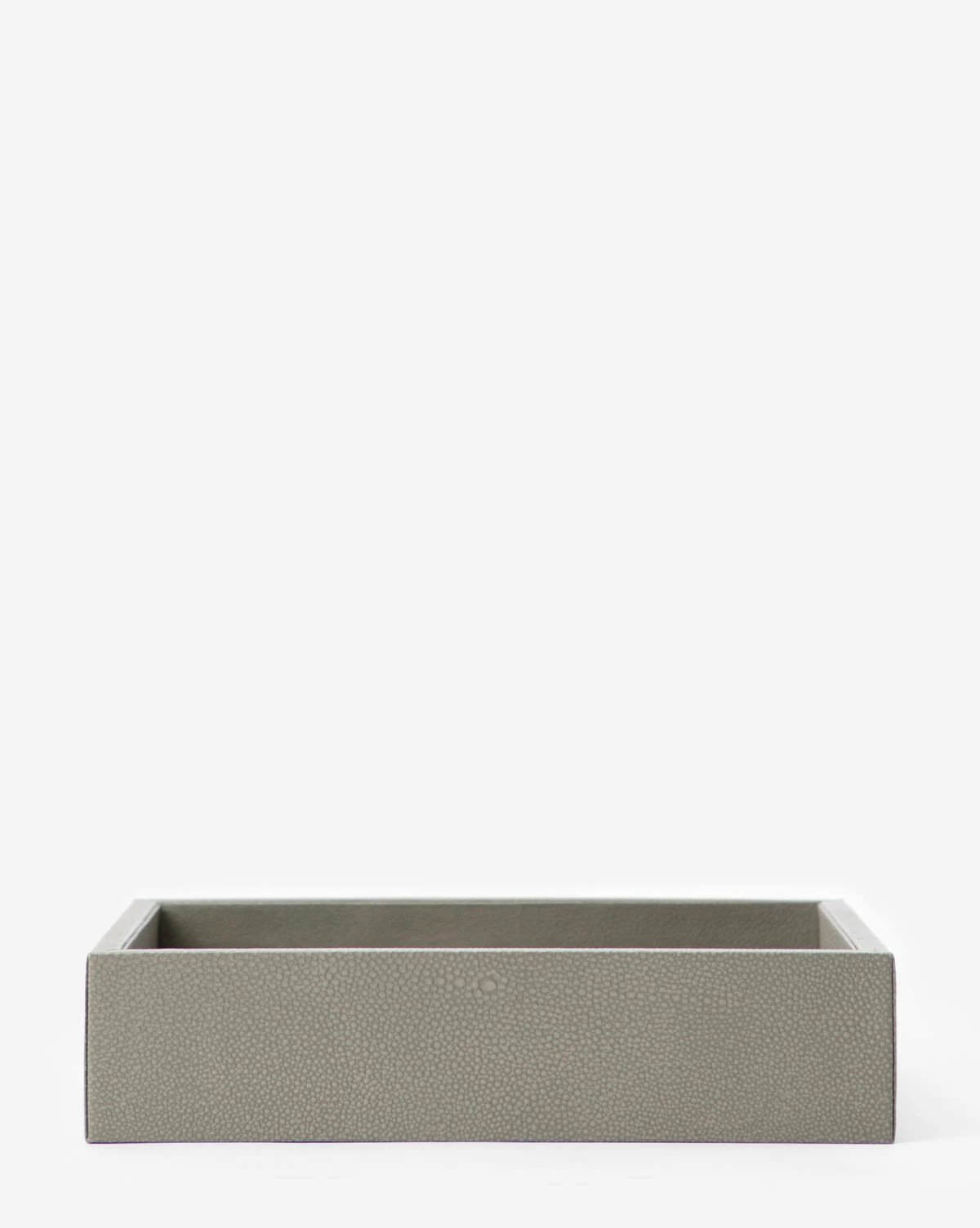 In a moody dark gray, the Gray Shagreen Tray is perfect for adding dimension and interest to vignettes on consoles or coffee tables. Its shagreen leather beautifully covers each surface of the box, bringing a uniform palette that seamlessly complements your decor.
