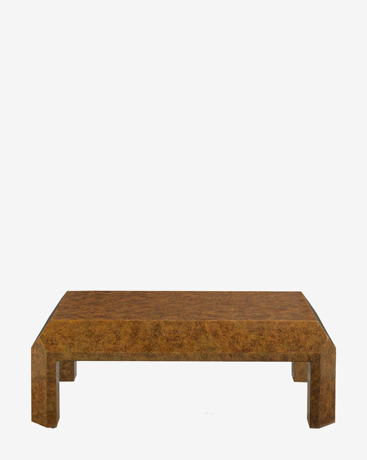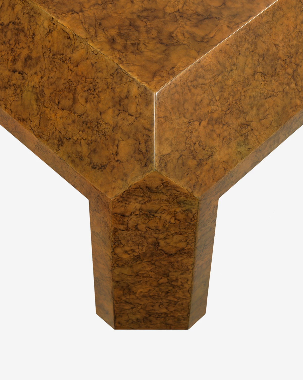 In a faux tortoise finish, the Gwydion Coffee Table boasts a creative, contemporary design. Its geometric structure makes a sculptural piece that features unique edges, seamlessly elevating your living space.