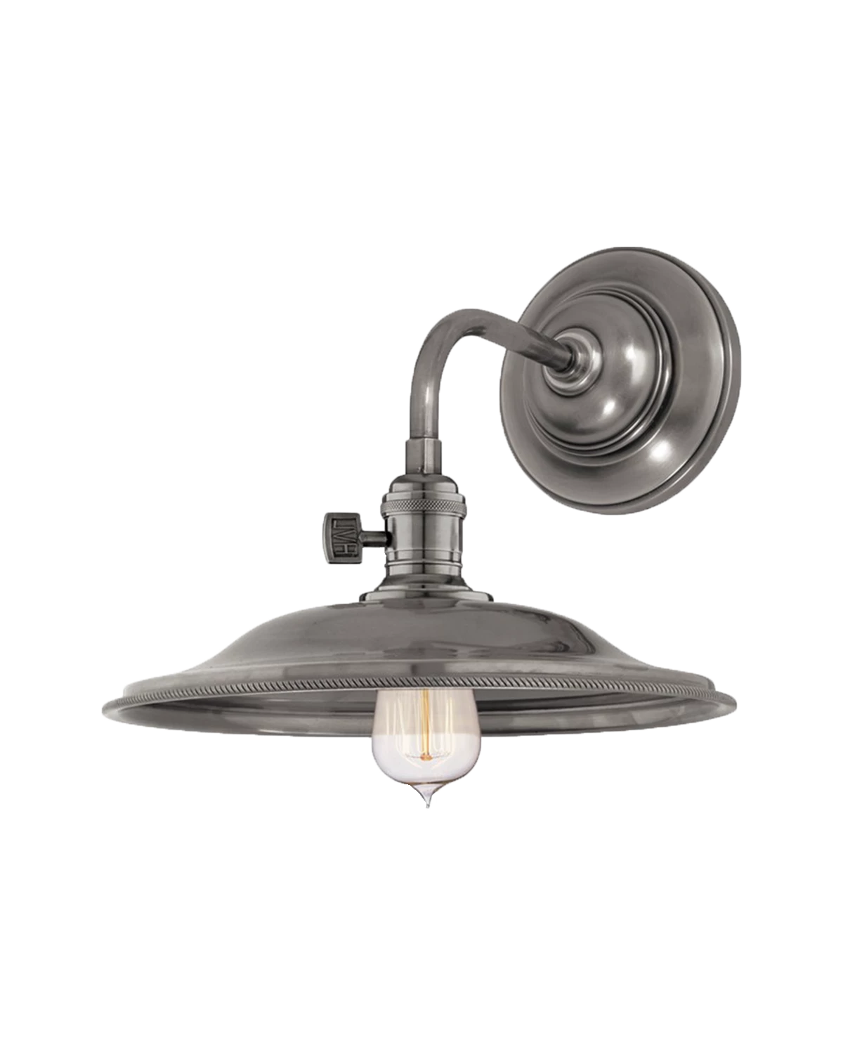 With a shallow, tapered shade and thoughtful metallic detailing, the Heirloom Sconce brings industrial style to your space. The functionality of its curved stem is complemented by aesthetic nuances from its monogrammed paddle switch to embossed trim details on the wall mount and shade. Available in a variety of finishes and completed by an Edison-style filament bulb with a pointed tip, the Heirloom Sconce directs the eye and adds interest to your walls.